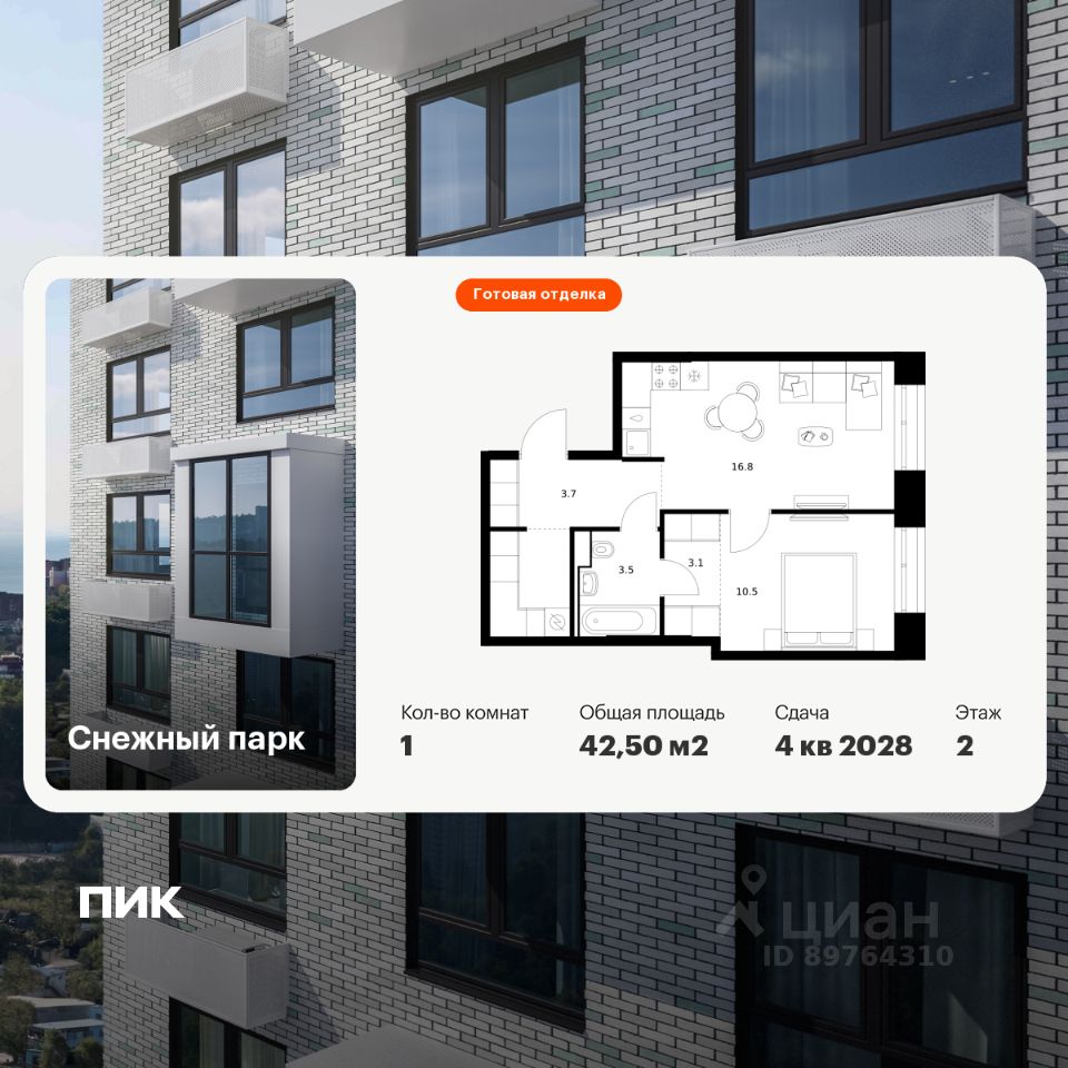 Продаётся 1-комн. квартира площадью 42,5 кв.м на 2 этаже 25 этажного дома (Корпус 4, Секция 2) проекта ПИК Снежный парк. Светлый просторный подъезд на уровне земли, функциональная планировка, большие окна, c отделкой. Жилой квартал ''Снежный парк'' возводится в развитом микрорайоне Владивостока - Снеговой Пади. Рядом уже есть всё для комфортной жизни: 2 школы, детская и взрослая поликлиники, торговый центр и магазины. Проект будет состоять из 7 корпусов, высота которых от 24 до 29 этажей. Благодаря низкой плотности застройки жители будут чувствовать себя комфортно. За счёт переменной этажности в квартиры будет попадать ещё больше естественного света. Из окон последних этажей будет открываться панорамный вид на Амурский залив и лес. В квартирах предусмотрены большие окна, застеклённые балконы и лоджии - будет светло и уютно даже зимой. В жилом квартале появится уникальное общественное пространство с пешеходным бульваром и зонами для отдыха. На первых этажах откроются кафе, магазины и полезные сервисы, куда можно спуститься за горячим кофе или свежеиспечённым хлебом. Из каждого дома будет выход в уютный двор-парк с современными детскими и спортивными площадками. Здесь мы посадим цветы и деревья: будет приятно отдыхать или почитать книгу. Артикул 1050558 (Застройщик ООО ''СЗ ФОРМУЛА-ДВ'')