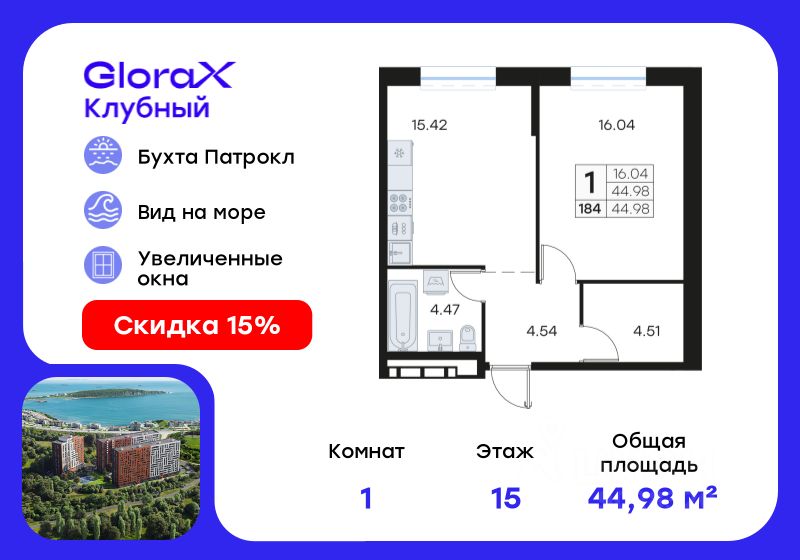 Продается 1-комн. квартира на 15-м этаже в квартале GloraX Клубный. GloraX Клубный - уникальный видовой проект с выделяющейся архитектурой в развитом районе Владивостока. Общая площадь лота составляет 44,98 кв. м, из которых 16,04 кв. м отведено под жилую и 15,42 кв. м под кухонную зону. Номер квартиры - 184. Преимущества квартиры: евро-двухкомнатная квартира, высокий этаж, гардеробная. Преимущества проекта: • Квартиры с панорамными видами на бухту Патрокл, маяк Басаргина и остров Русский • Планировочные решения под любой жизненный сценарий от 23 до 67 м² • Гардеробные комнаты, увеличенные панорамные окна, просторные кухни-гостиные • Эксклюзивное благоустройство: продуманное зонирование, игровые и спортивные площадки, площадка для стритбола, амфитеатр • Премиальный дизайн входных групп с лаунж-зоной • Безбарьерная среда, закрытая территория, видеонаблюдение • Лапомойки, колясочные и туалеты на первом этаже • Двухуровневый подземный паркинг на 350 машино-мест с лифтом на жилые этажи • Келлеры на цокольном этаже для хранения сезонных вещей с доступом на лифте • Современный ландшафтный дизайн комплекса от DEREVOPARK GloraX Клубный заповедник в черте мегаполиса. Комплекс тщательно продуман для максимального удобства и обеспечения безопасности его жителей. Квартал расположен в одном из самых современных развивающихся районов города: совсем рядом раскинулась живописная бухта Патрокл, где можно прогуляться по облагороженной пешеходной набережной, заглянуть на пляж или в школу серфинга. Комплекс имеет прекрасную транспортную доступность: рядом проходит объездная трасса СеданкаПатрокл, а до центар можно доехать всего за 15 минут. Проект включает 3 монолитных корпуса, каждый из которых спроектирован с акцентом на комфорт, безопасность и современный образ жизни рядом с уникальной природой. Общий двор создает приватную территорию для житей комплекса. В комплексе предусмотрен двухуровневый подземный паркинг на 350 машино-мест с доступом прямо с жилых этажей. Паркинг оборудован современными системами видеонаблюдения, контроля въезда-выезда и пожаротушения. На цокольном этаже размещаются келлеры для хранения сезонных и габаритных вещей. Доступ к кладовым на лифте с жилых этажей. Современный ландшафтный дизайн жилого комплекса GloraX Клубный создан ведущей российской студией DEREVOPARK. Во дворе для детей всех возрастов предусмотрены различные игровые площадки с лазалками, батутами, качелями и песочницей. В центре расположен специальный ''зеленый остров'', где взрослые могут отдохнуть на качелях и гамаках в тени больших деревьев. Для любителей спорта предусмотрены две специальные спортивные площадки для настольного тенниса и стритбола — для зрителей тоже найдется место! А еще на территории комплекса будет дорожка для роллеров и любителей покататься на велосипеде, самокате или скейте. В шаговой доступности располагаются все необходимые объекты социальной и коммерческой инфраструктуры. Ц