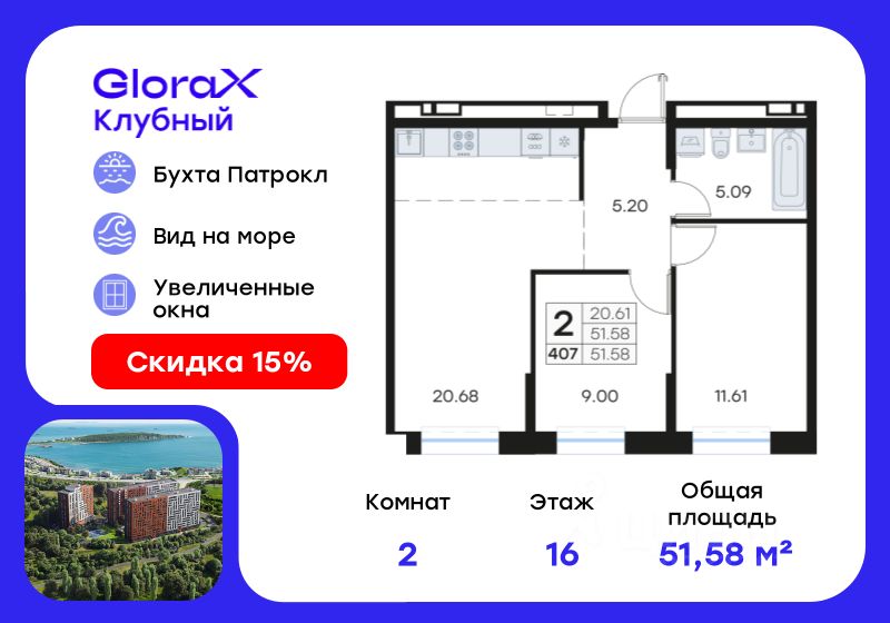 Продается 2-комн. квартира на 16-м этаже в квартале GloraX Клубный. GloraX Клубный - уникальный видовой проект с выделяющейся архитектурой в развитом районе Владивостока. Общая площадь лота составляет 51,58 кв. м, из которых 20,61 кв. м отведено под жилую и 20,68 кв. м под кухонную зону. Номер квартиры - 407. Преимущества квартиры: евро-трехкомнатная квартира, высокий этаж. Преимущества проекта: • Квартиры с панорамными видами на бухту Патрокл, маяк Басаргина и остров Русский • Планировочные решения под любой жизненный сценарий от 23 до 67 м² • Гардеробные комнаты, увеличенные панорамные окна, просторные кухни-гостиные • Эксклюзивное благоустройство: продуманное зонирование, игровые и спортивные площадки, площадка для стритбола, амфитеатр • Премиальный дизайн входных групп с лаунж-зоной • Безбарьерная среда, закрытая территория, видеонаблюдение • Лапомойки, колясочные и туалеты на первом этаже • Двухуровневый подземный паркинг на 350 машино-мест с лифтом на жилые этажи • Келлеры на цокольном этаже для хранения сезонных вещей с доступом на лифте • Современный ландшафтный дизайн комплекса от DEREVOPARK GloraX Клубный заповедник в черте мегаполиса. Комплекс тщательно продуман для максимального удобства и обеспечения безопасности его жителей. Квартал расположен в одном из самых современных развивающихся районов города: совсем рядом раскинулась живописная бухта Патрокл, где можно прогуляться по облагороженной пешеходной набережной, заглянуть на пляж или в школу серфинга. Комплекс имеет прекрасную транспортную доступность: рядом проходит объездная трасса СеданкаПатрокл, а до центар можно доехать всего за 15 минут. Проект включает 3 монолитных корпуса, каждый из которых спроектирован с акцентом на комфорт, безопасность и современный образ жизни рядом с уникальной природой. Общий двор создает приватную территорию для житей комплекса. В комплексе предусмотрен двухуровневый подземный паркинг на 350 машино-мест с доступом прямо с жилых этажей. Паркинг оборудован современными системами видеонаблюдения, контроля въезда-выезда и пожаротушения. На цокольном этаже размещаются келлеры для хранения сезонных и габаритных вещей. Доступ к кладовым на лифте с жилых этажей. Современный ландшафтный дизайн жилого комплекса GloraX Клубный создан ведущей российской студией DEREVOPARK. Во дворе для детей всех возрастов предусмотрены различные игровые площадки с лазалками, батутами, качелями и песочницей. В центре расположен специальный ''зеленый остров'', где взрослые могут отдохнуть на качелях и гамаках в тени больших деревьев. Для любителей спорта предусмотрены две специальные спортивные площадки для настольного тенниса и стритбола — для зрителей тоже найдется место! А еще на территории комплекса будет дорожка для роллеров и любителей покататься на велосипеде, самокате или скейте. В шаговой доступности располагаются все необходимые объекты социальной и коммерческой инфраструктуры. Цена указана п