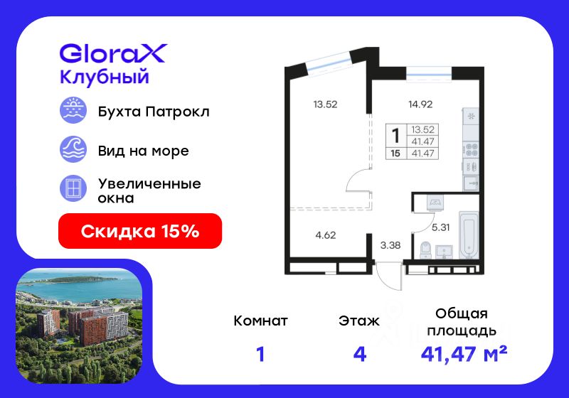 Продается 1-комн. квартира на 4-м этаже в квартале GloraX Клубный. GloraX Клубный - уникальный видовой проект с выделяющейся архитектурой в развитом районе Владивостока. Общая площадь лота составляет 41,47 кв. м, из которых 13,52 кв. м отведено под жилую и 14,92 кв. м под кухонную зону. Номер квартиры - 15. Преимущества квартиры: евро-двухкомнатная квартира, гардеробная. Преимущества проекта: • Квартиры с панорамными видами на бухту Патрокл, маяк Басаргина и остров Русский • Планировочные решения под любой жизненный сценарий от 23 до 67 м² • Гардеробные комнаты, увеличенные панорамные окна, просторные кухни-гостиные • Эксклюзивное благоустройство: продуманное зонирование, игровые и спортивные площадки, площадка для стритбола, амфитеатр • Премиальный дизайн входных групп с лаунж-зоной • Безбарьерная среда, закрытая территория, видеонаблюдение • Лапомойки, колясочные и туалеты на первом этаже • Двухуровневый подземный паркинг на 350 машино-мест с лифтом на жилые этажи • Келлеры на цокольном этаже для хранения сезонных вещей с доступом на лифте • Современный ландшафтный дизайн комплекса от DEREVOPARK GloraX Клубный заповедник в черте мегаполиса. Комплекс тщательно продуман для максимального удобства и обеспечения безопасности его жителей. Квартал расположен в одном из самых современных развивающихся районов города: совсем рядом раскинулась живописная бухта Патрокл, где можно прогуляться по облагороженной пешеходной набережной, заглянуть на пляж или в школу серфинга. Комплекс имеет прекрасную транспортную доступность: рядом проходит объездная трасса СеданкаПатрокл, а до центар можно доехать всего за 15 минут. Проект включает 3 монолитных корпуса, каждый из которых спроектирован с акцентом на комфорт, безопасность и современный образ жизни рядом с уникальной природой. Общий двор создает приватную территорию для житей комплекса. В комплексе предусмотрен двухуровневый подземный паркинг на 350 машино-мест с доступом прямо с жилых этажей. Паркинг оборудован современными системами видеонаблюдения, контроля въезда-выезда и пожаротушения. На цокольном этаже размещаются келлеры для хранения сезонных и габаритных вещей. Доступ к кладовым на лифте с жилых этажей. Современный ландшафтный дизайн жилого комплекса GloraX Клубный создан ведущей российской студией DEREVOPARK. Во дворе для детей всех возрастов предусмотрены различные игровые площадки с лазалками, батутами, качелями и песочницей. В центре расположен специальный ''зеленый остров'', где взрослые могут отдохнуть на качелях и гамаках в тени больших деревьев. Для любителей спорта предусмотрены две специальные спортивные площадки для настольного тенниса и стритбола — для зрителей тоже найдется место! А еще на территории комплекса будет дорожка для роллеров и любителей покататься на велосипеде, самокате или скейте. В шаговой доступности располагаются все необходимые объекты социальной и коммерческой инфраструктуры. Цена указана при