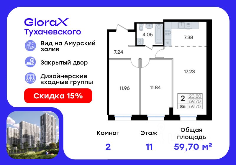 Продается 2-комн. квартира на 11-м этаже в жилом комплексе GloraX Тухачевского — современном проекте нового формата в престижном районе Владивостока. Общая площадь лота составляет 59,70 кв. м, из которых 23,80 кв. м отведено под жилую и 7,38 кв. м под кухонную зону. Номер квартиры - 86. Преимущества квартиры: двухкомнатная квартира. Преимущества проекта: • Панорамный вид на Амурский залив и зелёные сопки • Удачное расположение и транспортная доступность: Первореченский район, 20 минут до центра города • Закрытая охраняемая территория с доступом только для жителей • Эксклюзивное благоустройство: продуманное зонирование, игровые и спортивные площадки, арт-инсталляция, Тайный сад • Безбарьерная среда, видеонаблюдений, Wi-Fi на территории • Премиальный дизайн входных групп реcепшн и лаунж-зоной • Лапомойки, колясочные и туалеты на первом этаже • Подземный паркинг на 449 машиномест с доступом на лифте с жилых этажей • Индивидуальные кладовые на цокольном этаже от 2 до 10 м2 GloraX Тухачевского — это городское пространство нового формата, которое позволяет современным горожанам находить все необходимые атрибуты комфортной жизни внутри своего жилого комплекса. Весь комплекс спроектирован так, чтобы жить здесь было удобно и безопасно: светлые лаунж-зоны и ресепшн на входах в жилые корпуса, эксклюзивный дизайн мест общего пользования и придомовой территории, круглосуточная охрана, видеонаблюдение и даже детский сад в одном из корпусов все, что необходимо современному городскому жителю. GloraX Тухачевского находится в одном из самых престижных районов города с хорошей, давно сформировавшейся инфраструктурой и отличной транспортной доступностью. Отсюда легко добраться до центра города, других районов и даже пригорода как на собственном транспорте, так и на общественном. Квартал имеет прямой выезд на ул. Тухачевского, а рядом с комплексом расположена автобусная остановка на несколько маршрутов. Проект состоит из 3 монолитных корпусов, объединенных единым стилобатом. В комплексе предусмотрены: подземный паркинг с лифтом на жилые этажи, кладовые для хранения, благоустроенный двор без машин, детские и спортивные площадки, зоны для отдыха и прогулок. Эксклюзивный проект благоустройства территории разработан одной из лучших студий ландшафтного дизайна DEREVOPARK с фокусом на комфорт и удобство для всех жителей комплекса. Вся необходимая инфраструктура — магазины, школы, детские сады, остановки общественного транспорта — находится рядом. Узнайте подробности и подберите свою квартиру в GloraX Тухачевского — в отделе продаж уже сегодня. Цена указана при 100% оплате или стандартной ипотеке. Узнайте подробности в Отделе продаж.