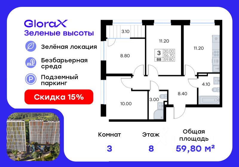 Продается 3-комн. квартира на 8-м этаже в жилом квартале GloraX Зелёные высоты — проекте в тихой зелёной локации. Общая площадь квартиры 59,80 кв. м, из которых 30,00 кв. м включая 30,00 кв. м жилого пространства и 11,20 кв. м кухни. Номер квартиры - 88. Преимущества квартиры: угловая 3 к.кв., много окон, лоджия. Преимущества проекта: • Идеальное сочетание городской и загородной жизни • Сдаем в 2025 году • Уютный зелёный район с развитой инфраструктурой • Великолепные виды на Вечнозеленый сквер и лесопарк на 150 Га • Видеонаблюдение, IP-домофон, Wi-Fi на территории, • Дизайнерские входные группы • Безбарьерная среда, колясочные, туалеты на 1 этаже, лапомойки • Эксклюзивное благоустройство территории • Подземный паркинг на 235 машино-мест с лифтом на жилые этажи • Индивидуальные кладовые от 3 до 7 кв. м • Черновая отделка для реализации любых дизайнерских идей GloraX Зелёные высоты — современный жилой проект, сочетающий преимущества городской и пригородной жизни. Комплекс тщательно продуман для максимального удобства и обеспечения безопасности жителей. Квартал расположен в зеленом, живописном и активно развивающемся районе Зеленый Угол, вдали от серой массовой застройки. Жители GloraX Зелёные высоты смогут насладждаться прогулками в Вечнозелёном сквере или лесопарке. В непосредственной близости находятся остановки общественного транспорта и автомобильный подъезд со стороны Нейбута. Скоро также появится выездом на трассу Де-Фриз-Седанка, что обеспечит быстрый доступ в любую часть города и пригород. Проект включает 2 корпуса, каждый из которых спроектирован с акцентом на комфорт, безопасность и современный образ жизни. В комплексе предусмотрен подземный паркинг на 235 машиномест с доступом прямо с жилых этажей. Паркинг оборудован современными системами видеонаблюдения, контроля въезда-выезда и пожаротушения. Цокольный этаж здания отведен под индивидуальные кладовые площадью от 3 до 7 квадратных метров, которые можно использовать для хранения сезонных вещей. Доступ к кладовым - на лифте с жилых этажей. Территория жилого квартала благоустроена и включает игровые зоны и спортивные площадки для детей различных возрастных групп, уютные зоны отдыха со скамейками и универсальную воркаут-площадку для активного досуга. В шаговой доступности располагаются все необходимые объекты социальной инфраструктуры. Узнайте больше в отделе продаж — выберите свою квартиру в GloraX Зелёные высоты уже сегодня!