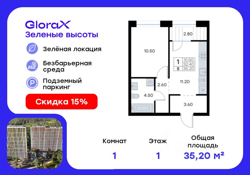 Продается 1-комн. квартира на 11-м этаже в жилом квартале GloraX Зелёные высоты — проекте в тихой зелёной локации. Общая площадь квартиры 35,40 кв. м, из которых 10,40 кв. м включая 10,40 кв. м жилого пространства и 13,60 кв. м кухни. Номер квартиры - 608. Преимущества квартиры: компактная евро-2, лоджия. Преимущества проекта: • Идеальное сочетание городской и загородной жизни • Сдаем в 2025 году • Уютный зелёный район с развитой инфраструктурой • Великолепные виды на Вечнозеленый сквер и лесопарк на 150 Га • Видеонаблюдение, IP-домофон, Wi-Fi на территории, • Дизайнерские входные группы • Безбарьерная среда, колясочные, туалеты на 1 этаже, лапомойки • Эксклюзивное благоустройство территории • Подземный паркинг на 235 машино-мест с лифтом на жилые этажи • Индивидуальные кладовые от 3 до 7 кв. м • Черновая отделка для реализации любых дизайнерских идей GloraX Зелёные высоты — современный жилой проект, сочетающий преимущества городской и пригородной жизни. Комплекс тщательно продуман для максимального удобства и обеспечения безопасности жителей. Квартал расположен в зеленом, живописном и активно развивающемся районе Зеленый Угол, вдали от серой массовой застройки. Жители GloraX Зелёные высоты смогут насладждаться прогулками в Вечнозелёном сквере или лесопарке. В непосредственной близости находятся остановки общественного транспорта и автомобильный подъезд со стороны Нейбута. Скоро также появится выездом на трассу Де-Фриз-Седанка, что обеспечит быстрый доступ в любую часть города и пригород. Проект включает 2 корпуса, каждый из которых спроектирован с акцентом на комфорт, безопасность и современный образ жизни. В комплексе предусмотрен подземный паркинг на 235 машиномест с доступом прямо с жилых этажей. Паркинг оборудован современными системами видеонаблюдения, контроля въезда-выезда и пожаротушения. Цокольный этаж здания отведен под индивидуальные кладовые площадью от 3 до 7 квадратных метров, которые можно использовать для хранения сезонных вещей. Доступ к кладовым - на лифте с жилых этажей. Территория жилого квартала благоустроена и включает игровые зоны и спортивные площадки для детей различных возрастных групп, уютные зоны отдыха со скамейками и универсальную воркаут-площадку для активного досуга. В шаговой доступности располагаются все необходимые объекты социальной инфраструктуры. Узнайте больше в отделе продаж — выберите свою квартиру в GloraX Зелёные высоты уже сегодня!