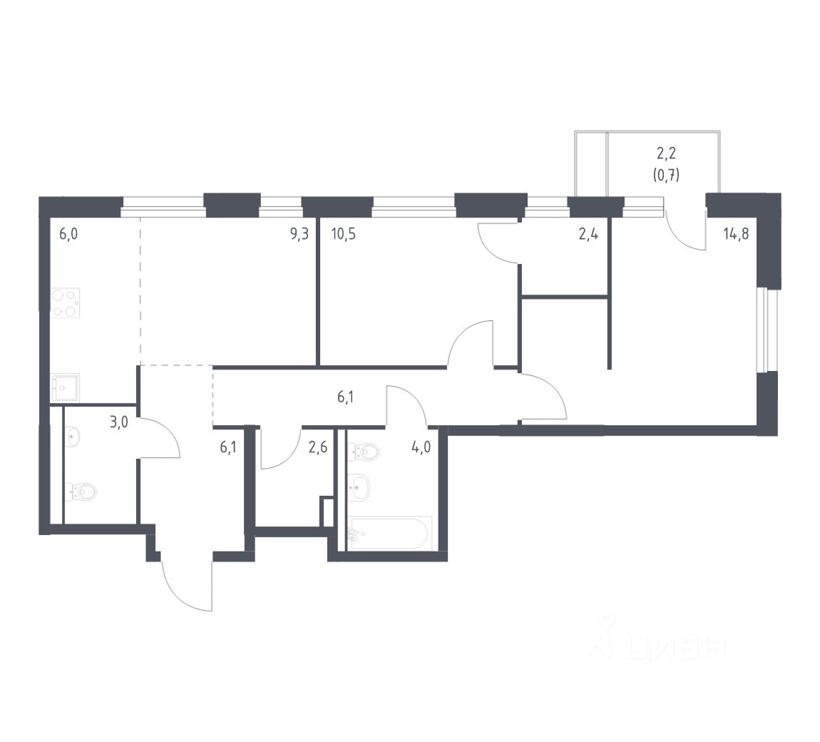 В продаже 3-комнатная квартира в корпусе 2 ЖК 'Сабанеева 125'. Квартира располагается на 11 этаже, общая площадь 77.4 м2.