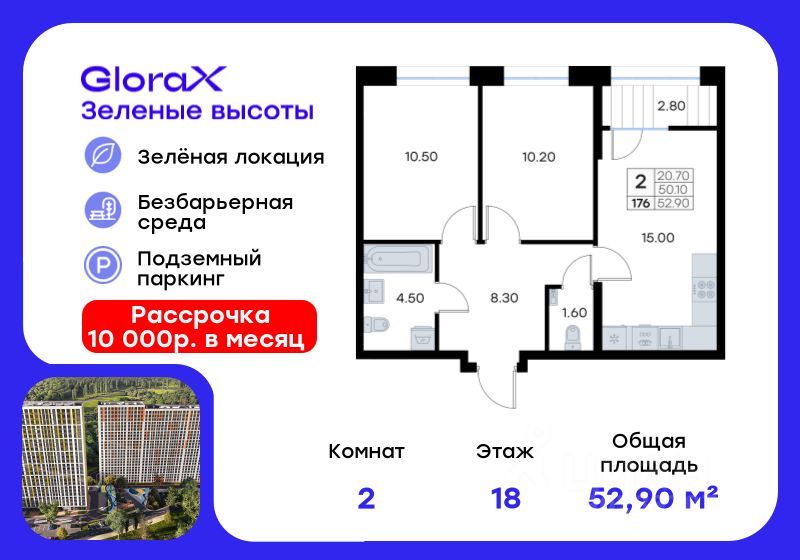 Продается 2-комн. квартира на 18-м этаже в жилом квартале GloraX Зелёные высоты — проекте в тихой зелёной локации. Общая площадь квартиры 52,90 кв. м, из которых 20,70 кв. м включая 20,70 кв. м жилого пространства и 15,00 кв. м кухни. Номер квартиры - 176. Преимущества квартиры: компактная евро-3, лоджия. Преимущества проекта: • Идеальное сочетание городской и загородной жизни • Сдаем в 2025 году • Уютный зелёный район с развитой инфраструктурой • Великолепные виды на Вечнозеленый сквер и лесопарк на 150 Га • Видеонаблюдение, IP-домофон, Wi-Fi на территории, • Дизайнерские входные группы • Безбарьерная среда, колясочные, туалеты на 1 этаже, лапомойки • Эксклюзивное благоустройство территории • Подземный паркинг на 235 машино-мест с лифтом на жилые этажи • Индивидуальные кладовые от 3 до 7 кв. м • Черновая отделка для реализации любых дизайнерских идей GloraX Зелёные высоты — современный жилой проект, сочетающий преимущества городской и пригородной жизни. Комплекс тщательно продуман для максимального удобства и обеспечения безопасности жителей. Квартал расположен в зеленом, живописном и активно развивающемся районе Зеленый Угол, вдали от серой массовой застройки. Жители GloraX Зелёные высоты смогут насладждаться прогулками в Вечнозелёном сквере или лесопарке. В непосредственной близости находятся остановки общественного транспорта и автомобильный подъезд со стороны Нейбута. Скоро также появится выездом на трассу Де-Фриз-Седанка, что обеспечит быстрый доступ в любую часть города и пригород. Проект включает 2 корпуса, каждый из которых спроектирован с акцентом на комфорт, безопасность и современный образ жизни. В комплексе предусмотрен подземный паркинг на 235 машиномест с доступом прямо с жилых этажей. Паркинг оборудован современными системами видеонаблюдения, контроля въезда-выезда и пожаротушения. Цокольный этаж здания отведен под индивидуальные кладовые площадью от 3 до 7 квадратных метров, которые можно использовать для хранения сезонных вещей. Доступ к кладовым - на лифте с жилых этажей. Территория жилого квартала благоустроена и включает игровые зоны и спортивные площадки для детей различных возрастных групп, уютные зоны отдыха со скамейками и универсальную воркаут-площадку для активного досуга. В шаговой доступности располагаются все необходимые объекты социальной инфраструктуры. Узнайте больше в отделе продаж — выберите свою квартиру в GloraX Зелёные высоты уже сегодня!