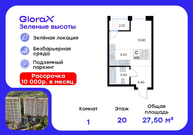Продается квартира-студия на 20-м этаже в жилом квартале GloraX Зелёные высоты — проекте в тихой зелёной локации. Общая площадь квартиры 27,50 кв. м, из которых 13,80 кв. м включая 13,80 кв. м жилого пространства и 3,60 кв. м кухни. Номер квартиры - 455. Преимущества квартиры: зонируемая студия, лоджия. Преимущества проекта: • Идеальное сочетание городской и загородной жизни • Сдаем в 2025 году • Уютный зелёный район с развитой инфраструктурой • Великолепные виды на Вечнозеленый сквер и лесопарк на 150 Га • Видеонаблюдение, IP-домофон, Wi-Fi на территории, • Дизайнерские входные группы • Безбарьерная среда, колясочные, туалеты на 1 этаже, лапомойки • Эксклюзивное благоустройство территории • Подземный паркинг на 235 машино-мест с лифтом на жилые этажи • Индивидуальные кладовые от 3 до 7 кв. м • Черновая отделка для реализации любых дизайнерских идей GloraX Зелёные высоты — современный жилой проект, сочетающий преимущества городской и пригородной жизни. Комплекс тщательно продуман для максимального удобства и обеспечения безопасности жителей. Квартал расположен в зеленом, живописном и активно развивающемся районе Зеленый Угол, вдали от серой массовой застройки. Жители GloraX Зелёные высоты смогут насладждаться прогулками в Вечнозелёном сквере или лесопарке. В непосредственной близости находятся остановки общественного транспорта и автомобильный подъезд со стороны Нейбута. Скоро также появится выездом на трассу Де-Фриз-Седанка, что обеспечит быстрый доступ в любую часть города и пригород. Проект включает 2 корпуса, каждый из которых спроектирован с акцентом на комфорт, безопасность и современный образ жизни. В комплексе предусмотрен подземный паркинг на 235 машиномест с доступом прямо с жилых этажей. Паркинг оборудован современными системами видеонаблюдения, контроля въезда-выезда и пожаротушения. Цокольный этаж здания отведен под индивидуальные кладовые площадью от 3 до 7 квадратных метров, которые можно использовать для хранения сезонных вещей. Доступ к кладовым - на лифте с жилых этажей. Территория жилого квартала благоустроена и включает игровые зоны и спортивные площадки для детей различных возрастных групп, уютные зоны отдыха со скамейками и универсальную воркаут-площадку для активного досуга. В шаговой доступности располагаются все необходимые объекты социальной инфраструктуры. Узнайте больше в отделе продаж — выберите свою квартиру в GloraX Зелёные высоты уже сегодня!