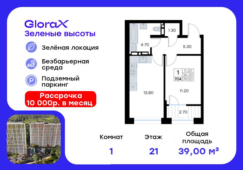 Продается 1-комн. квартира на 21-м этаже в жилом квартале GloraX Зелёные высоты — проекте в тихой зелёной локации. Общая площадь квартиры 39,00 кв. м, из которых 11,20 кв. м включая 11,20 кв. м жилого пространства и 13,80 кв. м кухни. Номер квартиры - 704. Преимущества квартиры: компактная евро-2, лоджия, гардеробная. Преимущества проекта: • Идеальное сочетание городской и загородной жизни • Сдаем в 2025 году • Уютный зелёный район с развитой инфраструктурой • Великолепные виды на Вечнозеленый сквер и лесопарк на 150 Га • Видеонаблюдение, IP-домофон, Wi-Fi на территории, • Дизайнерские входные группы • Безбарьерная среда, колясочные, туалеты на 1 этаже, лапомойки • Эксклюзивное благоустройство территории • Подземный паркинг на 235 машино-мест с лифтом на жилые этажи • Индивидуальные кладовые от 3 до 7 кв. м • Черновая отделка для реализации любых дизайнерских идей GloraX Зелёные высоты — современный жилой проект, сочетающий преимущества городской и пригородной жизни. Комплекс тщательно продуман для максимального удобства и обеспечения безопасности жителей. Квартал расположен в зеленом, живописном и активно развивающемся районе Зеленый Угол, вдали от серой массовой застройки. Жители GloraX Зелёные высоты смогут насладждаться прогулками в Вечнозелёном сквере или лесопарке. В непосредственной близости находятся остановки общественного транспорта и автомобильный подъезд со стороны Нейбута. Скоро также появится выездом на трассу Де-Фриз-Седанка, что обеспечит быстрый доступ в любую часть города и пригород. Проект включает 2 корпуса, каждый из которых спроектирован с акцентом на комфорт, безопасность и современный образ жизни. В комплексе предусмотрен подземный паркинг на 235 машиномест с доступом прямо с жилых этажей. Паркинг оборудован современными системами видеонаблюдения, контроля въезда-выезда и пожаротушения. Цокольный этаж здания отведен под индивидуальные кладовые площадью от 3 до 7 квадратных метров, которые можно использовать для хранения сезонных вещей. Доступ к кладовым - на лифте с жилых этажей. Территория жилого квартала благоустроена и включает игровые зоны и спортивные площадки для детей различных возрастных групп, уютные зоны отдыха со скамейками и универсальную воркаут-площадку для активного досуга. В шаговой доступности располагаются все необходимые объекты социальной инфраструктуры. Узнайте больше в отделе продаж — выберите свою квартиру в GloraX Зелёные высоты уже сегодня!