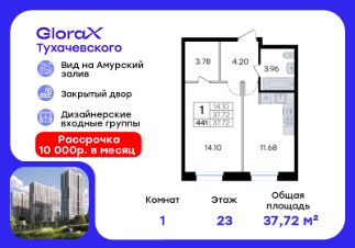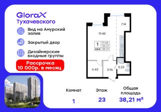Продается квартира-студия на 6-м этаже в жилом комплексе GloraX Тухачевского — современном проекте нового формата в престижном районе Владивостока. Общая площадь лота составляет 38,09 кв. м, из которых 19,42 кв. м отведено под жилую и 7,14 кв. м под кухонную зону. Номер квартиры - 274.Преимущества квартиры:студия, гардеробная.Преимущества проекта:• Панорамный вид на Амурский залив и зелёные сопки• Удачное расположение и транспортная доступность: Первореченский район, 20 минут до центра города• Закрытая охраняемая территория с доступом только для жителей• Эксклюзивное благоустройство: продуманное зонирование, игровые и спортивные площадки, арт-инсталляция, Тайный сад• Безбарьерная среда, видеонаблюдений, Wi-Fi на территории• Премиальный дизайн входных групп реcепшн и лаунж-зоной• Лапомойки, колясочные и туалеты на первом этаже• Подземный паркинг на 449 машиномест с доступом на лифте с жилых этажей• Индивидуальные кладовые на цокольном этаже от 2 до 10 м2GloraX Тухачевского — это городское пространство нового формата, которое позволяет современным горожанам находить все необходимые атрибуты комфортной жизни внутри своего жилого комплекса. Весь комплекс спроектирован так, чтобы жить здесь было удобно и безопасно: светлые лаунж-зоны и ресепшн на входах в жилые корпуса, эксклюзивный дизайн мест общего пользования и придомовой территории, круглосуточная охрана, видеонаблюдение и даже детский сад в одном из корпусов все, что необходимо современному городскому жителю. GloraX Тухачевского находится в одном из самых престижных районов города с хорошей, давно сформировавшейся инфраструктурой и отличной транспортной доступностью. Отсюда легко добраться до центра города, других районов и даже пригорода как на собственном транспорте, так и на общественном. Квартал имеет прямой выезд на ул. Тухачевского, а рядом с комплексом расположена автобусная остановка на несколько маршрутов.Проект состоит из 3 монолитных корпусов, объединенных единым стилобатом. В комплексе предусмотрены: подземный паркинг с лифтом на жилые этажи, кладовые для хранения, благоустроенный двор без машин, детские и спортивные площадки, зоны для отдыха и прогулок.Эксклюзивный проект благоустройства территории разработан одной из лучших студий ландшафтного дизайна DEREVOPARK с фокусом на комфорт и удобство для всех жителей комплекса.Вся необходимая инфраструктура — магазины, школы, детские сады, остановки общественного транспорта — находится рядом.Узнайте подробности и подберите свою квартиру в GloraX Тухачевского — в отделе продаж уже сегодня.Цена указана при 100% оплате или стандартной ипотеке. Узнайте подробности в Отделе продаж.