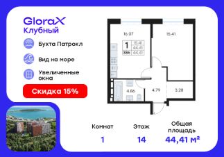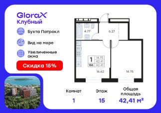 Продается 1-комн. квартира на 4-м этаже в квартале GloraX Клубный. GloraX Клубный - уникальный видовой проект с выделяющейся архитектурой в развитом районе Владивостока. Общая площадь лота составляет 41,47 кв. м, из которых 13,52 кв. м отведено под жилую и 14,92 кв. м под кухонную зону. Номер квартиры - 15.Преимущества квартиры:евро-двухкомнатная квартира, гардеробная.Преимущества проекта:• Квартиры с панорамными видами на бухту Патрокл, маяк Басаргина и остров Русский• Планировочные решения под любой жизненный сценарий от 23 до 67 м²• Гардеробные комнаты, увеличенные панорамные окна, просторные кухни-гостиные• Эксклюзивное благоустройство: продуманное зонирование, игровые и спортивные площадки, площадка для стритбола, амфитеатр• Премиальный дизайн входных групп с лаунж-зоной• Безбарьерная среда, закрытая территория, видеонаблюдение• Лапомойки, колясочные и туалеты на первом этаже• Двухуровневый подземный паркинг на 350 машино-мест с лифтом на жилые этажи• Келлеры на цокольном этаже для хранения сезонных вещей с доступом на лифте• Современный ландшафтный дизайн комплекса от DEREVOPARKGloraX Клубный заповедник в черте мегаполиса. Комплекс тщательно продуман для максимального удобства и обеспечения безопасности его жителей. Квартал расположен в одном из самых современных развивающихся районов города: совсем рядом раскинулась живописная бухта Патрокл, где можно прогуляться по облагороженной пешеходной набережной, заглянуть на пляж или в школу серфинга. Комплекс имеет прекрасную транспортную доступность: рядом проходит объездная трасса СеданкаПатрокл, а до центар можно доехать всего за 15 минут.Проект включает 3 монолитных корпуса, каждый из которых спроектирован с акцентом на комфорт, безопасность и современный образ жизни рядом с уникальной природой. Общий двор создает приватную территорию для житей комплекса.В комплексе предусмотрен двухуровневый подземный паркинг на 350 машино-мест с доступом прямо с жилых этажей. Паркинг оборудован современными системами видеонаблюдения, контроля въезда-выезда и пожаротушения. На цокольном этаже размещаются келлеры для хранения сезонных и габаритных вещей. Доступ к кладовым на лифте с жилых этажей. Современный ландшафтный дизайн жилого комплекса GloraX Клубный создан ведущей российской студией DEREVOPARK. Во дворе для детей всех возрастов предусмотрены различные игровые площадки с лазалками, батутами, качелями и песочницей. В центре расположен специальный ''зеленый остров'', где взрослые могут отдохнуть на качелях и гамаках в тени больших деревьев. Для любителей спорта предусмотрены две специальные спортивные площадки для настольного тенниса и стритбола — для зрителей тоже найдется место! А еще на территории комплекса будет дорожка для роллеров и любителей покататься на велосипеде, самокате или скейте.В шаговой доступности располагаются все необходимые объекты социальной и коммерческой инфраструктуры.Цена указана при
