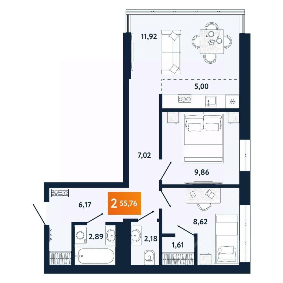 Продаётся 2-комнатная квартира в строящемся доме (Дом 1), срок сдачи: II-кв. 2027, общей площадью 57.26 кв.м., на 12 этаже.