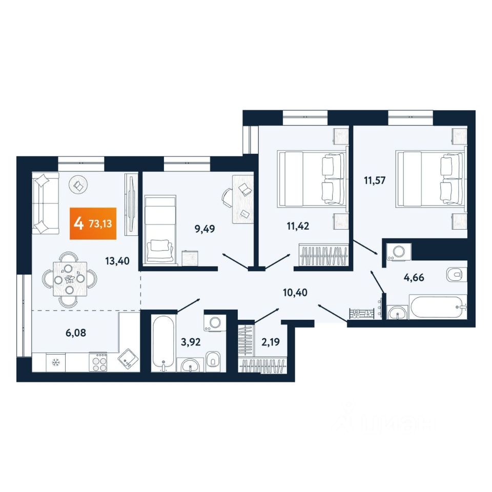 Продаётся 4-комнатная квартира в строящемся доме (Дом 1), срок сдачи: II-кв. 2027, общей площадью 72.95 кв.м., на 21 этаже.