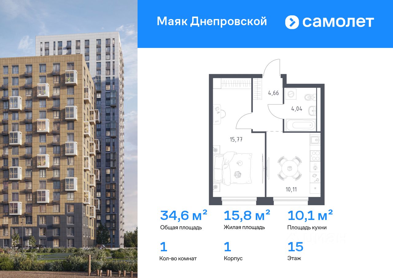 Строим кварталы для жизни с заботой о будущем. Предлагается 1-комнатная квартира комфорт-класса 34,58 кв.м в корпусе 1 на 15 этаже, в ЖК ''Маяк Днепровской'' Квартира с предчистовой отделкой. Доступность дополнительных опций уточняйте у застройщика. Приобрести квартиру возможно по специальным акциям от застройщика, с текущими условиями акций можно ознакомиться в блоке ''Акций''. Цена динамическая и может отличаться, уточняйте актуальность у застройщика. ''Маяк Днепровской'' — это маленький город с домами высотой от 17 до 30 этажей. Мы строим современные здания со стилобатами и террасами, которые отвечают архитектурным трендам, но при этом гармонично вписываются в окружающие пейзажи. Переменная этажность домов повторяет уникальный дальневосточный ландшафт, а оттенки фасадов перекликаются с красками природы. Здесь вы будете любоваться живописными закатами и встречать рассветы с панорамного балкона.