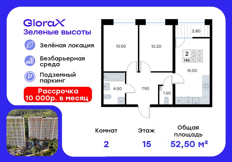 Продается 2-комн. квартира на 15-м этаже в жилом квартале GloraX Зелёные высоты — проекте в тихой зелёной локации. Общая площадь квартиры 52,50 кв. м, из которых 20,70 кв. м включая 20,70 кв. м жилого пространства и 15,00 кв. м кухни. Номер квартиры - 146. Преимущества квартиры: компактная евро-3, лоджия. Преимущества проекта: • Идеальное сочетание городской и загородной жизни • Сдаем в 2025 году • Уютный зелёный район с развитой инфраструктурой • Великолепные виды на Вечнозеленый сквер и лесопарк на 150 Га • Видеонаблюдение, IP-домофон, Wi-Fi на территории, • Дизайнерские входные группы • Безбарьерная среда, колясочные, туалеты на 1 этаже, лапомойки • Эксклюзивное благоустройство территории • Подземный паркинг на 235 машино-мест с лифтом на жилые этажи • Индивидуальные кладовые от 3 до 7 кв. м • Черновая отделка для реализации любых дизайнерских идей GloraX Зелёные высоты — современный жилой проект, сочетающий преимущества городской и пригородной жизни. Комплекс тщательно продуман для максимального удобства и обеспечения безопасности жителей. Квартал расположен в зеленом, живописном и активно развивающемся районе Зеленый Угол, вдали от серой массовой застройки. Жители GloraX Зелёные высоты смогут насладждаться прогулками в Вечнозелёном сквере или лесопарке. В непосредственной близости находятся остановки общественного транспорта и автомобильный подъезд со стороны Нейбута. Скоро также появится выездом на трассу Де-Фриз-Седанка, что обеспечит быстрый доступ в любую часть города и пригород. Проект включает 2 корпуса, каждый из которых спроектирован с акцентом на комфорт, безопасность и современный образ жизни. В комплексе предусмотрен подземный паркинг на 235 машиномест с доступом прямо с жилых этажей. Паркинг оборудован современными системами видеонаблюдения, контроля въезда-выезда и пожаротушения. Цокольный этаж здания отведен под индивидуальные кладовые площадью от 3 до 7 квадратных метров, которые можно использовать для хранения сезонных вещей. Доступ к кладовым - на лифте с жилых этажей. Территория жилого квартала благоустроена и включает игровые зоны и спортивные площадки для детей различных возрастных групп, уютные зоны отдыха со скамейками и универсальную воркаут-площадку для активного досуга. В шаговой доступности располагаются все необходимые объекты социальной инфраструктуры. Узнайте больше в отделе продаж — выберите свою квартиру в GloraX Зелёные высоты уже сегодня!