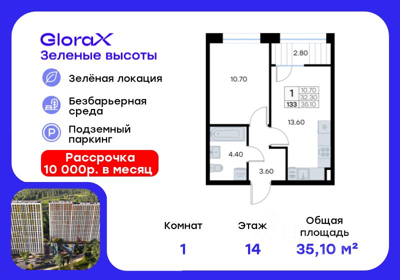 Продается 1-комн. квартира на 14-м этаже в жилом квартале GloraX Зелёные высоты — проекте в тихой зелёной локации. Общая площадь квартиры 35,10 кв. м, из которых 10,70 кв. м включая 10,70 кв. м жилого пространства и 13,60 кв. м кухни. Номер квартиры - 133. Преимущества квартиры: компактная евро-2, лоджия. Преимущества проекта: • Идеальное сочетание городской и загородной жизни • Сдаем в 2025 году • Уютный зелёный район с развитой инфраструктурой • Великолепные виды на Вечнозеленый сквер и лесопарк на 150 Га • Видеонаблюдение, IP-домофон, Wi-Fi на территории, • Дизайнерские входные группы • Безбарьерная среда, колясочные, туалеты на 1 этаже, лапомойки • Эксклюзивное благоустройство территории • Подземный паркинг на 235 машино-мест с лифтом на жилые этажи • Индивидуальные кладовые от 3 до 7 кв. м • Черновая отделка для реализации любых дизайнерских идей GloraX Зелёные высоты — современный жилой проект, сочетающий преимущества городской и пригородной жизни. Комплекс тщательно продуман для максимального удобства и обеспечения безопасности жителей. Квартал расположен в зеленом, живописном и активно развивающемся районе Зеленый Угол, вдали от серой массовой застройки. Жители GloraX Зелёные высоты смогут насладждаться прогулками в Вечнозелёном сквере или лесопарке. В непосредственной близости находятся остановки общественного транспорта и автомобильный подъезд со стороны Нейбута. Скоро также появится выездом на трассу Де-Фриз-Седанка, что обеспечит быстрый доступ в любую часть города и пригород. Проект включает 2 корпуса, каждый из которых спроектирован с акцентом на комфорт, безопасность и современный образ жизни. В комплексе предусмотрен подземный паркинг на 235 машиномест с доступом прямо с жилых этажей. Паркинг оборудован современными системами видеонаблюдения, контроля въезда-выезда и пожаротушения. Цокольный этаж здания отведен под индивидуальные кладовые площадью от 3 до 7 квадратных метров, которые можно использовать для хранения сезонных вещей. Доступ к кладовым - на лифте с жилых этажей. Территория жилого квартала благоустроена и включает игровые зоны и спортивные площадки для детей различных возрастных групп, уютные зоны отдыха со скамейками и универсальную воркаут-площадку для активного досуга. В шаговой доступности располагаются все необходимые объекты социальной инфраструктуры. Узнайте больше в отделе продаж — выберите свою квартиру в GloraX Зелёные высоты уже сегодня!