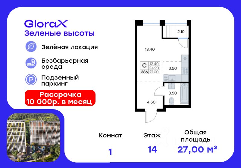 Продается квартира-студия на 14-м этаже в жилом квартале GloraX Зелёные высоты — проекте в тихой зелёной локации. Общая площадь квартиры 27,00 кв. м, из которых 13,40 кв. м включая 13,40 кв. м жилого пространства и 3,50 кв. м кухни. Номер квартиры - 386. Преимущества квартиры: зонируемая студия, лоджия. Преимущества проекта: • Идеальное сочетание городской и загородной жизни • Сдаем в 2025 году • Уютный зелёный район с развитой инфраструктурой • Великолепные виды на Вечнозеленый сквер и лесопарк на 150 Га • Видеонаблюдение, IP-домофон, Wi-Fi на территории, • Дизайнерские входные группы • Безбарьерная среда, колясочные, туалеты на 1 этаже, лапомойки • Эксклюзивное благоустройство территории • Подземный паркинг на 235 машино-мест с лифтом на жилые этажи • Индивидуальные кладовые от 3 до 7 кв. м • Черновая отделка для реализации любых дизайнерских идей GloraX Зелёные высоты — современный жилой проект, сочетающий преимущества городской и пригородной жизни. Комплекс тщательно продуман для максимального удобства и обеспечения безопасности жителей. Квартал расположен в зеленом, живописном и активно развивающемся районе Зеленый Угол, вдали от серой массовой застройки. Жители GloraX Зелёные высоты смогут насладждаться прогулками в Вечнозелёном сквере или лесопарке. В непосредственной близости находятся остановки общественного транспорта и автомобильный подъезд со стороны Нейбута. Скоро также появится выездом на трассу Де-Фриз-Седанка, что обеспечит быстрый доступ в любую часть города и пригород. Проект включает 2 корпуса, каждый из которых спроектирован с акцентом на комфорт, безопасность и современный образ жизни. В комплексе предусмотрен подземный паркинг на 235 машиномест с доступом прямо с жилых этажей. Паркинг оборудован современными системами видеонаблюдения, контроля въезда-выезда и пожаротушения. Цокольный этаж здания отведен под индивидуальные кладовые площадью от 3 до 7 квадратных метров, которые можно использовать для хранения сезонных вещей. Доступ к кладовым - на лифте с жилых этажей. Территория жилого квартала благоустроена и включает игровые зоны и спортивные площадки для детей различных возрастных групп, уютные зоны отдыха со скамейками и универсальную воркаут-площадку для активного досуга. В шаговой доступности располагаются все необходимые объекты социальной инфраструктуры. Узнайте больше в отделе продаж — выберите свою квартиру в GloraX Зелёные высоты уже сегодня!