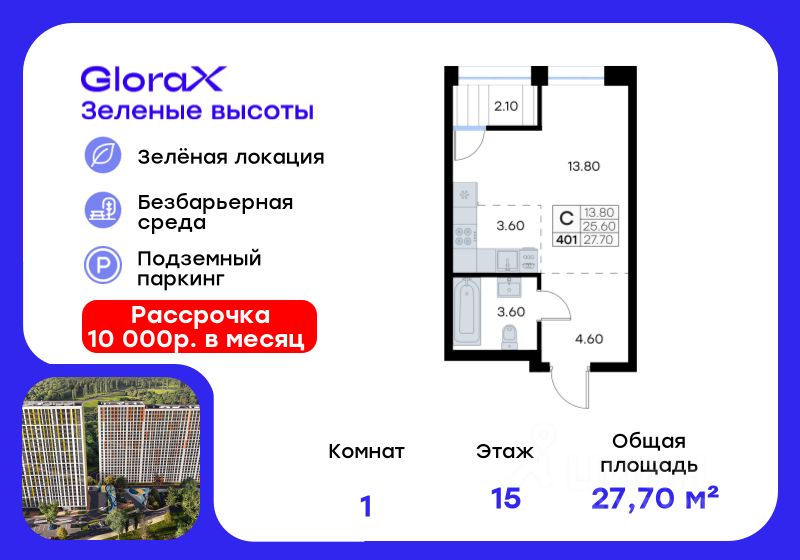 Продается квартира-студия на 15-м этаже в жилом квартале GloraX Зелёные высоты — проекте в тихой зелёной локации. Общая площадь квартиры 27,70 кв. м, из которых 13,80 кв. м включая 13,80 кв. м жилого пространства и 3,60 кв. м кухни. Номер квартиры - 401. Преимущества квартиры: зонируемая студия, лоджия. Преимущества проекта: • Идеальное сочетание городской и загородной жизни • Сдаем в 2025 году • Уютный зелёный район с развитой инфраструктурой • Великолепные виды на Вечнозеленый сквер и лесопарк на 150 Га • Видеонаблюдение, IP-домофон, Wi-Fi на территории, • Дизайнерские входные группы • Безбарьерная среда, колясочные, туалеты на 1 этаже, лапомойки • Эксклюзивное благоустройство территории • Подземный паркинг на 235 машино-мест с лифтом на жилые этажи • Индивидуальные кладовые от 3 до 7 кв. м • Черновая отделка для реализации любых дизайнерских идей GloraX Зелёные высоты — современный жилой проект, сочетающий преимущества городской и пригородной жизни. Комплекс тщательно продуман для максимального удобства и обеспечения безопасности жителей. Квартал расположен в зеленом, живописном и активно развивающемся районе Зеленый Угол, вдали от серой массовой застройки. Жители GloraX Зелёные высоты смогут насладждаться прогулками в Вечнозелёном сквере или лесопарке. В непосредственной близости находятся остановки общественного транспорта и автомобильный подъезд со стороны Нейбута. Скоро также появится выездом на трассу Де-Фриз-Седанка, что обеспечит быстрый доступ в любую часть города и пригород. Проект включает 2 корпуса, каждый из которых спроектирован с акцентом на комфорт, безопасность и современный образ жизни. В комплексе предусмотрен подземный паркинг на 235 машиномест с доступом прямо с жилых этажей. Паркинг оборудован современными системами видеонаблюдения, контроля въезда-выезда и пожаротушения. Цокольный этаж здания отведен под индивидуальные кладовые площадью от 3 до 7 квадратных метров, которые можно использовать для хранения сезонных вещей. Доступ к кладовым - на лифте с жилых этажей. Территория жилого квартала благоустроена и включает игровые зоны и спортивные площадки для детей различных возрастных групп, уютные зоны отдыха со скамейками и универсальную воркаут-площадку для активного досуга. В шаговой доступности располагаются все необходимые объекты социальной инфраструктуры. Узнайте больше в отделе продаж — выберите свою квартиру в GloraX Зелёные высоты уже сегодня!