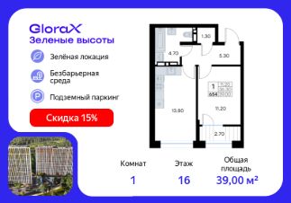 Продается 1-комн. квартира на 16-м этаже в жилом квартале GloraX Зелёные высоты — проекте в тихой зелёной локации. Общая площадь квартиры 39,00 кв. м, из которых 11,20 кв. м включая 11,20 кв. м жилого пространства и 13,80 кв. м кухни. Номер квартиры - 654.Преимущества квартиры:компактная евро-2, лоджия, гардеробная.Преимущества проекта:• Идеальное сочетание городской и загородной жизни• Сдаем в 2025 году• Уютный зелёный район с развитой инфраструктурой• Великолепные виды на Вечнозеленый сквер и лесопарк на 150 Га• Видеонаблюдение, IP-домофон, Wi-Fi на территории,• Дизайнерские входные группы• Безбарьерная среда, колясочные, туалеты на 1 этаже, лапомойки• Эксклюзивное благоустройство территории • Подземный паркинг на 235 машино-мест с лифтом на жилые этажи• Индивидуальные кладовые от 3 до 7 кв. м• Черновая отделка для реализации любых дизайнерских идейGloraX Зелёные высоты — современный жилой проект, сочетающий преимущества городской и пригородной жизни. Комплекс тщательно продуман для максимального удобства и обеспечения безопасности жителей. Квартал расположен в зеленом, живописном и активно развивающемся районе Зеленый Угол, вдали от серой массовой застройки. Жители GloraX Зелёные высоты смогут насладждаться прогулками в Вечнозелёном сквере или лесопарке. В непосредственной близости находятся остановки общественного транспорта и автомобильный подъезд со стороны Нейбута. Скоро также появится выездом на трассу Де-Фриз-Седанка, что обеспечит быстрый доступ в любую часть города и пригород.Проект включает 2 корпуса, каждый из которых спроектирован с акцентом на комфорт, безопасность и современный образ жизни.В комплексе предусмотрен подземный паркинг на 235 машиномест с доступом прямо с жилых этажей. Паркинг оборудован современными системами видеонаблюдения, контроля въезда-выезда и пожаротушения. Цокольный этаж здания отведен под индивидуальные кладовые площадью от 3 до 7 квадратных метров, которые можно использовать для хранения сезонных вещей. Доступ к кладовым - на лифте с жилых этажей.Территория жилого квартала благоустроена и включает игровые зоны и спортивные площадки для детей различных возрастных групп, уютные зоны отдыха со скамейками и универсальную воркаут-площадку для активного досуга.В шаговой доступности располагаются все необходимые объекты социальной инфраструктуры.Узнайте больше в отделе продаж — выберите свою квартиру в GloraX Зелёные высоты уже сегодня!