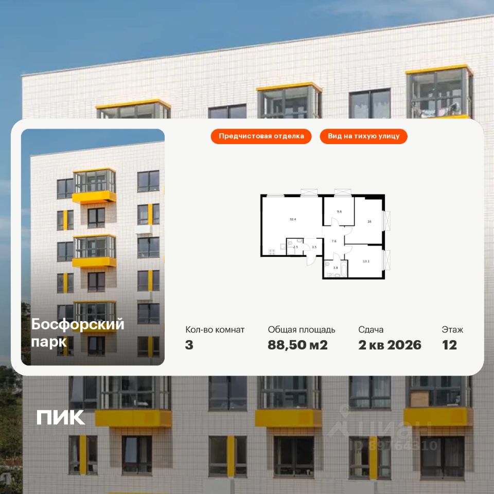 Продаётся 3-комн. квартира площадью 88,5 кв.м на 12 этаже 17 этажного дома (Корпус 5, Секция 1) проекта ПИК Босфорский парк. Светлый просторный подъезд на уровне земли, функциональная планировка, большие окна, предчистовая отделка. Жилой квартал ''Босфорский парк'' расположен на юге Владивостока, в районе живописной бухты Патрокл. Из окон домов будет открываться прекрасный вид на залив и лес. Дорога до центра Владивостока на автомобиле займёт 20 минут. В ''Босфорском парке'' появится 20 жилых корпусов с магазинами, кафе и полезными сервисами на первых этажах. На территории проекта предусмотрены два многоуровневых надземных паркинга. В квартале будет много мест для отдыха и активных игр, три вида парков и даже родник, который будет перетекать в ручей с порогами и препятствиями. На территории парков появятся амфитеатры и террасы. Здесь жители смогут отдыхать, гулять, общаться, учиться или работать на свежем воздухе. На естественных склонах будут обустроены игровые зоны для детей - с горками, сетками, канатами и скалолазными зацепами. Всё это - новый формат благоустройства ''Многоуровневый ландшафт'', который разработан специально для регионов с перепадами высот. Ещё на этапе проектирования архитекторы учли все особенности рельефа, чтобы создать органичное пространство. Артикул 937546 (Застройщик ООО ''СПЕЦИАЛИЗИРОВАННЫЙ ЗАСТРОЙЩИК ПИК-ПРИМОРЬЕ'')