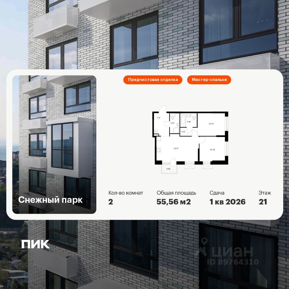 Продаётся 2-комн. квартира площадью 55,56 кв.м на 21 этаже 24 этажного дома (Корпус 2, Секция 2) проекта ПИК Снежный парк. Светлый просторный подъезд на уровне земли, функциональная планировка, большие окна, предчистовая отделка. Жилой квартал ''Снежный парк'' возводится в развитом микрорайоне Владивостока - Снеговой Пади. Рядом уже есть всё для комфортной жизни: 2 школы, детская и взрослая поликлиники, торговый центр и магазины. Проект будет состоять из 7 корпусов, высота которых от 24 до 29 этажей. Благодаря низкой плотности застройки жители будут чувствовать себя комфортно. За счёт переменной этажности в квартиры будет попадать ещё больше естественного света. Из окон последних этажей будет открываться панорамный вид на Амурский залив и лес. В квартирах предусмотрены большие окна, застеклённые балконы и лоджии - будет светло и уютно даже зимой. В жилом квартале появится уникальное общественное пространство с пешеходным бульваром и зонами для отдыха. На первых этажах откроются кафе, магазины и полезные сервисы, куда можно спуститься за горячим кофе или свежеиспечённым хлебом. Из каждого дома будет выход в уютный двор-парк с современными детскими и спортивными площадками. Здесь мы посадим цветы и деревья: будет приятно отдыхать или почитать книгу. Артикул 913166 (Застройщик ООО ''СЗ ФОРМУЛА-ДВ'')