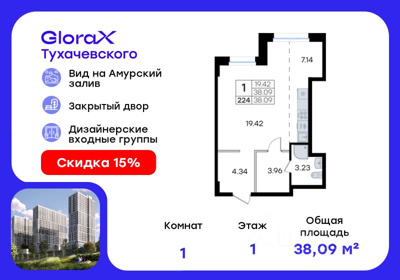 Продается квартира-студия на 1-м этаже в жилом комплексе GloraX Тухачевского — современном проекте нового формата в престижном районе Владивостока. Общая площадь лота составляет 38,09 кв. м, из которых 19,42 кв. м отведено под жилую и 7,14 кв. м под кухонную зону. Номер квартиры - 224. Преимущества квартиры: студия, гардеробная. Преимущества проекта: • Панорамный вид на Амурский залив и зелёные сопки • Удачное расположение и транспортная доступность: Первореченский район, 20 минут до центра города • Закрытая охраняемая территория с доступом только для жителей • Эксклюзивное благоустройство: продуманное зонирование, игровые и спортивные площадки, арт-инсталляция, Тайный сад • Безбарьерная среда, видеонаблюдений, Wi-Fi на территории • Премиальный дизайн входных групп реcепшн и лаунж-зоной • Лапомойки, колясочные и туалеты на первом этаже • Подземный паркинг на 449 машиномест с доступом на лифте с жилых этажей • Индивидуальные кладовые на цокольном этаже от 2 до 10 м2 GloraX Тухачевского — это городское пространство нового формата, которое позволяет современным горожанам находить все необходимые атрибуты комфортной жизни внутри своего жилого комплекса. Весь комплекс спроектирован так, чтобы жить здесь было удобно и безопасно: светлые лаунж-зоны и ресепшн на входах в жилые корпуса, эксклюзивный дизайн мест общего пользования и придомовой территории, круглосуточная охрана, видеонаблюдение и даже детский сад в одном из корпусов все, что необходимо современному городскому жителю. GloraX Тухачевского находится в одном из самых престижных районов города с хорошей, давно сформировавшейся инфраструктурой и отличной транспортной доступностью. Отсюда легко добраться до центра города, других районов и даже пригорода как на собственном транспорте, так и на общественном. Квартал имеет прямой выезд на ул. Тухачевского, а рядом с комплексом расположена автобусная остановка на несколько маршрутов. Проект состоит из 3 монолитных корпусов, объединенных единым стилобатом. В комплексе предусмотрены: подземный паркинг с лифтом на жилые этажи, кладовые для хранения, благоустроенный двор без машин, детские и спортивные площадки, зоны для отдыха и прогулок. Эксклюзивный проект благоустройства территории разработан одной из лучших студий ландшафтного дизайна DEREVOPARK с фокусом на комфорт и удобство для всех жителей комплекса. Вся необходимая инфраструктура — магазины, школы, детские сады, остановки общественного транспорта — находится рядом. Узнайте подробности и подберите свою квартиру в GloraX Тухачевского — в отделе продаж уже сегодня. Цена указана при 100% оплате или стандартной ипотеке. Узнайте подробности в Отделе продаж.