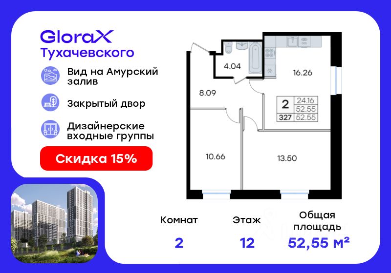 Продается 2-комн. квартира на 12-м этаже в жилом комплексе GloraX Тухачевского — современном проекте нового формата в престижном районе Владивостока. Общая площадь лота составляет 52,55 кв. м, из которых 24,16 кв. м отведено под жилую и 16,26 кв. м под кухонную зону. Номер квартиры - 327. Преимущества квартиры: двухкомнатная квартира, угловая. Преимущества проекта: • Панорамный вид на Амурский залив и зелёные сопки • Удачное расположение и транспортная доступность: Первореченский район, 20 минут до центра города • Закрытая охраняемая территория с доступом только для жителей • Эксклюзивное благоустройство: продуманное зонирование, игровые и спортивные площадки, арт-инсталляция, Тайный сад • Безбарьерная среда, видеонаблюдений, Wi-Fi на территории • Премиальный дизайн входных групп реcепшн и лаунж-зоной • Лапомойки, колясочные и туалеты на первом этаже • Подземный паркинг на 449 машиномест с доступом на лифте с жилых этажей • Индивидуальные кладовые на цокольном этаже от 2 до 10 м2 GloraX Тухачевского — это городское пространство нового формата, которое позволяет современным горожанам находить все необходимые атрибуты комфортной жизни внутри своего жилого комплекса. Весь комплекс спроектирован так, чтобы жить здесь было удобно и безопасно: светлые лаунж-зоны и ресепшн на входах в жилые корпуса, эксклюзивный дизайн мест общего пользования и придомовой территории, круглосуточная охрана, видеонаблюдение и даже детский сад в одном из корпусов все, что необходимо современному городскому жителю. GloraX Тухачевского находится в одном из самых престижных районов города с хорошей, давно сформировавшейся инфраструктурой и отличной транспортной доступностью. Отсюда легко добраться до центра города, других районов и даже пригорода как на собственном транспорте, так и на общественном. Квартал имеет прямой выезд на ул. Тухачевского, а рядом с комплексом расположена автобусная остановка на несколько маршрутов. Проект состоит из 3 монолитных корпусов, объединенных единым стилобатом. В комплексе предусмотрены: подземный паркинг с лифтом на жилые этажи, кладовые для хранения, благоустроенный двор без машин, детские и спортивные площадки, зоны для отдыха и прогулок. Эксклюзивный проект благоустройства территории разработан одной из лучших студий ландшафтного дизайна DEREVOPARK с фокусом на комфорт и удобство для всех жителей комплекса. Вся необходимая инфраструктура — магазины, школы, детские сады, остановки общественного транспорта — находится рядом. Узнайте подробности и подберите свою квартиру в GloraX Тухачевского — в отделе продаж уже сегодня. Цена указана при 100% оплате или стандартной ипотеке. Узнайте подробности в Отделе продаж.