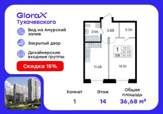 Продается квартира-студия на 21-м этаже в жилом комплексе GloraX Тухачевского — современном проекте нового формата в престижном районе Владивостока. Общая площадь лота составляет 38,21 кв. м, из которых 19,48 кв. м отведено под жилую и 7,14 кв. м под кухонную зону. Номер квартиры - 193.Преимущества квартиры:студия, высокий этаж, гардеробная.Преимущества проекта:• Панорамный вид на Амурский залив и зелёные сопки• Удачное расположение и транспортная доступность: Первореченский район, 20 минут до центра города• Закрытая охраняемая территория с доступом только для жителей• Эксклюзивное благоустройство: продуманное зонирование, игровые и спортивные площадки, арт-инсталляция, Тайный сад• Безбарьерная среда, видеонаблюдений, Wi-Fi на территории• Премиальный дизайн входных групп реcепшн и лаунж-зоной• Лапомойки, колясочные и туалеты на первом этаже• Подземный паркинг на 449 машиномест с доступом на лифте с жилых этажей• Индивидуальные кладовые на цокольном этаже от 2 до 10 м2GloraX Тухачевского — это городское пространство нового формата, которое позволяет современным горожанам находить все необходимые атрибуты комфортной жизни внутри своего жилого комплекса. Весь комплекс спроектирован так, чтобы жить здесь было удобно и безопасно: светлые лаунж-зоны и ресепшн на входах в жилые корпуса, эксклюзивный дизайн мест общего пользования и придомовой территории, круглосуточная охрана, видеонаблюдение и даже детский сад в одном из корпусов все, что необходимо современному городскому жителю. GloraX Тухачевского находится в одном из самых престижных районов города с хорошей, давно сформировавшейся инфраструктурой и отличной транспортной доступностью. Отсюда легко добраться до центра города, других районов и даже пригорода как на собственном транспорте, так и на общественном. Квартал имеет прямой выезд на ул. Тухачевского, а рядом с комплексом расположена автобусная остановка на несколько маршрутов.Проект состоит из 3 монолитных корпусов, объединенных единым стилобатом. В комплексе предусмотрены: подземный паркинг с лифтом на жилые этажи, кладовые для хранения, благоустроенный двор без машин, детские и спортивные площадки, зоны для отдыха и прогулок.Эксклюзивный проект благоустройства территории разработан одной из лучших студий ландшафтного дизайна DEREVOPARK с фокусом на комфорт и удобство для всех жителей комплекса.Вся необходимая инфраструктура — магазины, школы, детские сады, остановки общественного транспорта — находится рядом.Узнайте подробности и подберите свою квартиру в GloraX Тухачевского — в отделе продаж уже сегодня.Цена указана при 100% оплате или стандартной ипотеке. Узнайте подробности в Отделе продаж.
