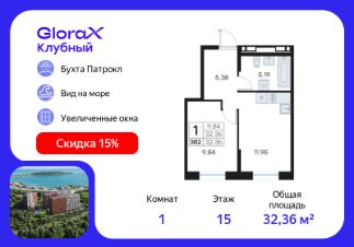 Продается 1-комн. квартира на 15-м этаже в квартале GloraX Клубный. GloraX Клубный - уникальный видовой проект с выделяющейся архитектурой в развитом районе Владивостока. Общая площадь лота составляет 32,36 кв. м, из которых 9,84 кв. м отведено под жилую и 11,95 кв. м под кухонную зону. Номер квартиры - 382.Преимущества квартиры:однокомнатная квартира, вид на море, высокий этаж.Преимущества проекта:• Квартиры с панорамными видами на бухту Патрокл, маяк Басаргина и остров Русский• Планировочные решения под любой жизненный сценарий от 23 до 67 м²• Гардеробные комнаты, увеличенные панорамные окна, просторные кухни-гостиные• Эксклюзивное благоустройство: продуманное зонирование, игровые и спортивные площадки, площадка для стритбола, амфитеатр• Премиальный дизайн входных групп с лаунж-зоной• Безбарьерная среда, закрытая территория, видеонаблюдение• Лапомойки, колясочные и туалеты на первом этаже• Двухуровневый подземный паркинг на 350 машино-мест с лифтом на жилые этажи• Келлеры на цокольном этаже для хранения сезонных вещей с доступом на лифте• Современный ландшафтный дизайн комплекса от DEREVOPARKGloraX Клубный заповедник в черте мегаполиса. Комплекс тщательно продуман для максимального удобства и обеспечения безопасности его жителей. Квартал расположен в одном из самых современных развивающихся районов города: совсем рядом раскинулась живописная бухта Патрокл, где можно прогуляться по облагороженной пешеходной набережной, заглянуть на пляж или в школу серфинга. Комплекс имеет прекрасную транспортную доступность: рядом проходит объездная трасса СеданкаПатрокл, а до центар можно доехать всего за 15 минут.Проект включает 3 монолитных корпуса, каждый из которых спроектирован с акцентом на комфорт, безопасность и современный образ жизни рядом с уникальной природой. Общий двор создает приватную территорию для житей комплекса.В комплексе предусмотрен двухуровневый подземный паркинг на 350 машино-мест с доступом прямо с жилых этажей. Паркинг оборудован современными системами видеонаблюдения, контроля въезда-выезда и пожаротушения. На цокольном этаже размещаются келлеры для хранения сезонных и габаритных вещей. Доступ к кладовым на лифте с жилых этажей. Современный ландшафтный дизайн жилого комплекса GloraX Клубный создан ведущей российской студией DEREVOPARK. Во дворе для детей всех возрастов предусмотрены различные игровые площадки с лазалками, батутами, качелями и песочницей. В центре расположен специальный ''зеленый остров'', где взрослые могут отдохнуть на качелях и гамаках в тени больших деревьев. Для любителей спорта предусмотрены две специальные спортивные площадки для настольного тенниса и стритбола — для зрителей тоже найдется место! А еще на территории комплекса будет дорожка для роллеров и любителей покататься на велосипеде, самокате или скейте.В шаговой доступности располагаются все необходимые объекты социальной и коммерческой инфраструктуры.Цена ук