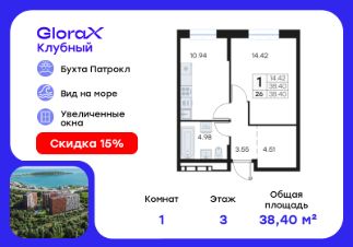 Продается 1-комн. квартира на 3-м этаже в квартале GloraX Клубный. GloraX Клубный - уникальный видовой проект с выделяющейся архитектурой в развитом районе Владивостока. Общая площадь лота составляет 38,40 кв. м, из которых 14,42 кв. м отведено под жилую и 10,94 кв. м под кухонную зону. Номер квартиры - 26.Преимущества квартиры:однокомнатная квартира, гардеробная.Преимущества проекта:• Квартиры с панорамными видами на бухту Патрокл, маяк Басаргина и остров Русский• Планировочные решения под любой жизненный сценарий от 23 до 67 м²• Гардеробные комнаты, увеличенные панорамные окна, просторные кухни-гостиные• Эксклюзивное благоустройство: продуманное зонирование, игровые и спортивные площадки, площадка для стритбола, амфитеатр• Премиальный дизайн входных групп с лаунж-зоной• Безбарьерная среда, закрытая территория, видеонаблюдение• Лапомойки, колясочные и туалеты на первом этаже• Двухуровневый подземный паркинг на 350 машино-мест с лифтом на жилые этажи• Келлеры на цокольном этаже для хранения сезонных вещей с доступом на лифте• Современный ландшафтный дизайн комплекса от DEREVOPARKGloraX Клубный заповедник в черте мегаполиса. Комплекс тщательно продуман для максимального удобства и обеспечения безопасности его жителей. Квартал расположен в одном из самых современных развивающихся районов города: совсем рядом раскинулась живописная бухта Патрокл, где можно прогуляться по облагороженной пешеходной набережной, заглянуть на пляж или в школу серфинга. Комплекс имеет прекрасную транспортную доступность: рядом проходит объездная трасса СеданкаПатрокл, а до центар можно доехать всего за 15 минут.Проект включает 3 монолитных корпуса, каждый из которых спроектирован с акцентом на комфорт, безопасность и современный образ жизни рядом с уникальной природой. Общий двор создает приватную территорию для житей комплекса.В комплексе предусмотрен двухуровневый подземный паркинг на 350 машино-мест с доступом прямо с жилых этажей. Паркинг оборудован современными системами видеонаблюдения, контроля въезда-выезда и пожаротушения. На цокольном этаже размещаются келлеры для хранения сезонных и габаритных вещей. Доступ к кладовым на лифте с жилых этажей. Современный ландшафтный дизайн жилого комплекса GloraX Клубный создан ведущей российской студией DEREVOPARK. Во дворе для детей всех возрастов предусмотрены различные игровые площадки с лазалками, батутами, качелями и песочницей. В центре расположен специальный ''зеленый остров'', где взрослые могут отдохнуть на качелях и гамаках в тени больших деревьев. Для любителей спорта предусмотрены две специальные спортивные площадки для настольного тенниса и стритбола — для зрителей тоже найдется место! А еще на территории комплекса будет дорожка для роллеров и любителей покататься на велосипеде, самокате или скейте.В шаговой доступности располагаются все необходимые объекты социальной и коммерческой инфраструктуры.Цена указана при 100%