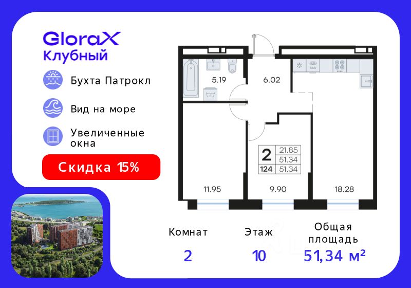 Продается 2-комн. квартира на 10-м этаже в квартале GloraX Клубный. GloraX Клубный - уникальный видовой проект с выделяющейся архитектурой в развитом районе Владивостока. Общая площадь лота составляет 51,34 кв. м, из которых 21,85 кв. м отведено под жилую и 18,28 кв. м под кухонную зону. Номер квартиры - 124. Преимущества квартиры: евро-трехкомнатная квартира, вид на море. Преимущества проекта: • Квартиры с панорамными видами на бухту Патрокл, маяк Басаргина и остров Русский • Планировочные решения под любой жизненный сценарий от 23 до 67 м² • Гардеробные комнаты, увеличенные панорамные окна, просторные кухни-гостиные • Эксклюзивное благоустройство: продуманное зонирование, игровые и спортивные площадки, площадка для стритбола, амфитеатр • Премиальный дизайн входных групп с лаунж-зоной • Безбарьерная среда, закрытая территория, видеонаблюдение • Лапомойки, колясочные и туалеты на первом этаже • Двухуровневый подземный паркинг на 350 машино-мест с лифтом на жилые этажи • Келлеры на цокольном этаже для хранения сезонных вещей с доступом на лифте • Современный ландшафтный дизайн комплекса от DEREVOPARK GloraX Клубный заповедник в черте мегаполиса. Комплекс тщательно продуман для максимального удобства и обеспечения безопасности его жителей. Квартал расположен в одном из самых современных развивающихся районов города: совсем рядом раскинулась живописная бухта Патрокл, где можно прогуляться по облагороженной пешеходной набережной, заглянуть на пляж или в школу серфинга. Комплекс имеет прекрасную транспортную доступность: рядом проходит объездная трасса СеданкаПатрокл, а до центар можно доехать всего за 15 минут. Проект включает 3 монолитных корпуса, каждый из которых спроектирован с акцентом на комфорт, безопасность и современный образ жизни рядом с уникальной природой. Общий двор создает приватную территорию для житей комплекса. В комплексе предусмотрен двухуровневый подземный паркинг на 350 машино-мест с доступом прямо с жилых этажей. Паркинг оборудован современными системами видеонаблюдения, контроля въезда-выезда и пожаротушения. На цокольном этаже размещаются келлеры для хранения сезонных и габаритных вещей. Доступ к кладовым на лифте с жилых этажей. Современный ландшафтный дизайн жилого комплекса GloraX Клубный создан ведущей российской студией DEREVOPARK. Во дворе для детей всех возрастов предусмотрены различные игровые площадки с лазалками, батутами, качелями и песочницей. В центре расположен специальный ''зеленый остров'', где взрослые могут отдохнуть на качелях и гамаках в тени больших деревьев. Для любителей спорта предусмотрены две специальные спортивные площадки для настольного тенниса и стритбола — для зрителей тоже найдется место! А еще на территории комплекса будет дорожка для роллеров и любителей покататься на велосипеде, самокате или скейте. В шаговой доступности располагаются все необходимые объекты социальной и коммерческой инфраструктуры. Цена указана пр