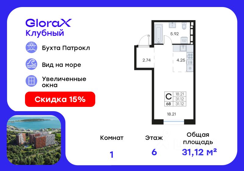 Продается квартира-студия на 6-м этаже в квартале GloraX Клубный. GloraX Клубный - уникальный видовой проект с выделяющейся архитектурой в развитом районе Владивостока. Общая площадь лота составляет 31,12 кв. м, из которых 18,21 кв. м отведено под жилую и 4,25 кв. м под кухонную зону. Номер квартиры - 68. Преимущества квартиры: студия, вид на море. Преимущества проекта: • Квартиры с панорамными видами на бухту Патрокл, маяк Басаргина и остров Русский • Планировочные решения под любой жизненный сценарий от 23 до 67 м² • Гардеробные комнаты, увеличенные панорамные окна, просторные кухни-гостиные • Эксклюзивное благоустройство: продуманное зонирование, игровые и спортивные площадки, площадка для стритбола, амфитеатр • Премиальный дизайн входных групп с лаунж-зоной • Безбарьерная среда, закрытая территория, видеонаблюдение • Лапомойки, колясочные и туалеты на первом этаже • Двухуровневый подземный паркинг на 350 машино-мест с лифтом на жилые этажи • Келлеры на цокольном этаже для хранения сезонных вещей с доступом на лифте • Современный ландшафтный дизайн комплекса от DEREVOPARK GloraX Клубный заповедник в черте мегаполиса. Комплекс тщательно продуман для максимального удобства и обеспечения безопасности его жителей. Квартал расположен в одном из самых современных развивающихся районов города: совсем рядом раскинулась живописная бухта Патрокл, где можно прогуляться по облагороженной пешеходной набережной, заглянуть на пляж или в школу серфинга. Комплекс имеет прекрасную транспортную доступность: рядом проходит объездная трасса СеданкаПатрокл, а до центар можно доехать всего за 15 минут. Проект включает 3 монолитных корпуса, каждый из которых спроектирован с акцентом на комфорт, безопасность и современный образ жизни рядом с уникальной природой. Общий двор создает приватную территорию для житей комплекса. В комплексе предусмотрен двухуровневый подземный паркинг на 350 машино-мест с доступом прямо с жилых этажей. Паркинг оборудован современными системами видеонаблюдения, контроля въезда-выезда и пожаротушения. На цокольном этаже размещаются келлеры для хранения сезонных и габаритных вещей. Доступ к кладовым на лифте с жилых этажей. Современный ландшафтный дизайн жилого комплекса GloraX Клубный создан ведущей российской студией DEREVOPARK. Во дворе для детей всех возрастов предусмотрены различные игровые площадки с лазалками, батутами, качелями и песочницей. В центре расположен специальный ''зеленый остров'', где взрослые могут отдохнуть на качелях и гамаках в тени больших деревьев. Для любителей спорта предусмотрены две специальные спортивные площадки для настольного тенниса и стритбола — для зрителей тоже найдется место! А еще на территории комплекса будет дорожка для роллеров и любителей покататься на велосипеде, самокате или скейте. В шаговой доступности располагаются все необходимые объекты социальной и коммерческой инфраструктуры. Цена указана при 100% оплате или стандарт