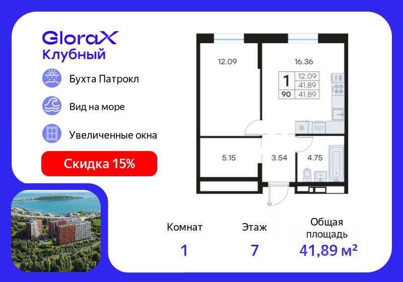 Продается 1-комн. квартира на 7-м этаже в квартале GloraX Клубный. GloraX Клубный - уникальный видовой проект с выделяющейся архитектурой в развитом районе Владивостока. Общая площадь лота составляет 41,89 кв. м, из которых 12,09 кв. м отведено под жилую и 16,36 кв. м под кухонную зону. Номер квартиры - 90. Преимущества квартиры: евро-двухкомнатная квартира, гардеробная. Преимущества проекта: • Квартиры с панорамными видами на бухту Патрокл, маяк Басаргина и остров Русский • Планировочные решения под любой жизненный сценарий от 23 до 67 м² • Гардеробные комнаты, увеличенные панорамные окна, просторные кухни-гостиные • Эксклюзивное благоустройство: продуманное зонирование, игровые и спортивные площадки, площадка для стритбола, амфитеатр • Премиальный дизайн входных групп с лаунж-зоной • Безбарьерная среда, закрытая территория, видеонаблюдение • Лапомойки, колясочные и туалеты на первом этаже • Двухуровневый подземный паркинг на 350 машино-мест с лифтом на жилые этажи • Келлеры на цокольном этаже для хранения сезонных вещей с доступом на лифте • Современный ландшафтный дизайн комплекса от DEREVOPARK GloraX Клубный заповедник в черте мегаполиса. Комплекс тщательно продуман для максимального удобства и обеспечения безопасности его жителей. Квартал расположен в одном из самых современных развивающихся районов города: совсем рядом раскинулась живописная бухта Патрокл, где можно прогуляться по облагороженной пешеходной набережной, заглянуть на пляж или в школу серфинга. Комплекс имеет прекрасную транспортную доступность: рядом проходит объездная трасса СеданкаПатрокл, а до центар можно доехать всего за 15 минут. Проект включает 3 монолитных корпуса, каждый из которых спроектирован с акцентом на комфорт, безопасность и современный образ жизни рядом с уникальной природой. Общий двор создает приватную территорию для житей комплекса. В комплексе предусмотрен двухуровневый подземный паркинг на 350 машино-мест с доступом прямо с жилых этажей. Паркинг оборудован современными системами видеонаблюдения, контроля въезда-выезда и пожаротушения. На цокольном этаже размещаются келлеры для хранения сезонных и габаритных вещей. Доступ к кладовым на лифте с жилых этажей. Современный ландшафтный дизайн жилого комплекса GloraX Клубный создан ведущей российской студией DEREVOPARK. Во дворе для детей всех возрастов предусмотрены различные игровые площадки с лазалками, батутами, качелями и песочницей. В центре расположен специальный ''зеленый остров'', где взрослые могут отдохнуть на качелях и гамаках в тени больших деревьев. Для любителей спорта предусмотрены две специальные спортивные площадки для настольного тенниса и стритбола — для зрителей тоже найдется место! А еще на территории комплекса будет дорожка для роллеров и любителей покататься на велосипеде, самокате или скейте. В шаговой доступности располагаются все необходимые объекты социальной и коммерческой инфраструктуры. Цена указана при