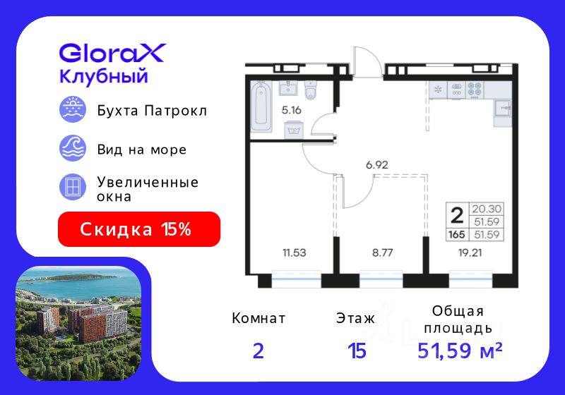 Продается 2-комн. квартира на 15-м этаже в квартале GloraX Клубный. GloraX Клубный - уникальный видовой проект с выделяющейся архитектурой в развитом районе Владивостока. Общая площадь лота составляет 51,59 кв. м, из которых 20,30 кв. м отведено под жилую и 19,21 кв. м под кухонную зону. Номер квартиры - 165. Преимущества квартиры: евро-трехкомнатная квартира, вид на море, высокий этаж. Преимущества проекта: • Квартиры с панорамными видами на бухту Патрокл, маяк Басаргина и остров Русский • Планировочные решения под любой жизненный сценарий от 23 до 67 м² • Гардеробные комнаты, увеличенные панорамные окна, просторные кухни-гостиные • Эксклюзивное благоустройство: продуманное зонирование, игровые и спортивные площадки, площадка для стритбола, амфитеатр • Премиальный дизайн входных групп с лаунж-зоной • Безбарьерная среда, закрытая территория, видеонаблюдение • Лапомойки, колясочные и туалеты на первом этаже • Двухуровневый подземный паркинг на 350 машино-мест с лифтом на жилые этажи • Келлеры на цокольном этаже для хранения сезонных вещей с доступом на лифте • Современный ландшафтный дизайн комплекса от DEREVOPARK GloraX Клубный заповедник в черте мегаполиса. Комплекс тщательно продуман для максимального удобства и обеспечения безопасности его жителей. Квартал расположен в одном из самых современных развивающихся районов города: совсем рядом раскинулась живописная бухта Патрокл, где можно прогуляться по облагороженной пешеходной набережной, заглянуть на пляж или в школу серфинга. Комплекс имеет прекрасную транспортную доступность: рядом проходит объездная трасса СеданкаПатрокл, а до центар можно доехать всего за 15 минут. Проект включает 3 монолитных корпуса, каждый из которых спроектирован с акцентом на комфорт, безопасность и современный образ жизни рядом с уникальной природой. Общий двор создает приватную территорию для житей комплекса. В комплексе предусмотрен двухуровневый подземный паркинг на 350 машино-мест с доступом прямо с жилых этажей. Паркинг оборудован современными системами видеонаблюдения, контроля въезда-выезда и пожаротушения. На цокольном этаже размещаются келлеры для хранения сезонных и габаритных вещей. Доступ к кладовым на лифте с жилых этажей. Современный ландшафтный дизайн жилого комплекса GloraX Клубный создан ведущей российской студией DEREVOPARK. Во дворе для детей всех возрастов предусмотрены различные игровые площадки с лазалками, батутами, качелями и песочницей. В центре расположен специальный ''зеленый остров'', где взрослые могут отдохнуть на качелях и гамаках в тени больших деревьев. Для любителей спорта предусмотрены две специальные спортивные площадки для настольного тенниса и стритбола — для зрителей тоже найдется место! А еще на территории комплекса будет дорожка для роллеров и любителей покататься на велосипеде, самокате или скейте. В шаговой доступности располагаются все необходимые объекты социальной и коммерческой инфраструктуры. Ц