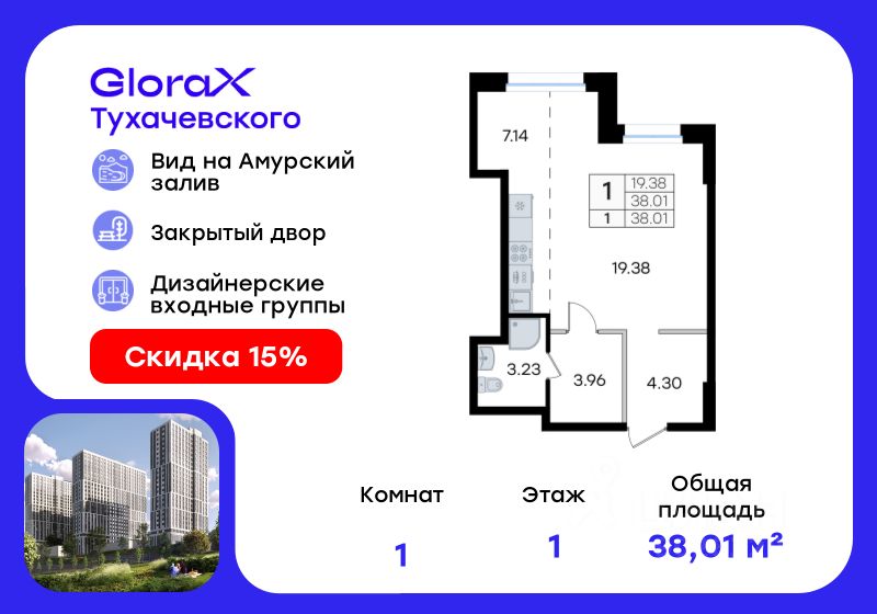 Продается квартира-студия на 1-м этаже в жилом комплексе GloraX Тухачевского — современном проекте нового формата в престижном районе Владивостока. Общая площадь лота составляет 38,01 кв. м, из которых 19,38 кв. м отведено под жилую и 7,14 кв. м под кухонную зону. Номер квартиры - 1. Преимущества квартиры: студия, гардеробная. Преимущества проекта: • Панорамный вид на Амурский залив и зелёные сопки • Удачное расположение и транспортная доступность: Первореченский район, 20 минут до центра города • Закрытая охраняемая территория с доступом только для жителей • Эксклюзивное благоустройство: продуманное зонирование, игровые и спортивные площадки, арт-инсталляция, Тайный сад • Безбарьерная среда, видеонаблюдений, Wi-Fi на территории • Премиальный дизайн входных групп реcепшн и лаунж-зоной • Лапомойки, колясочные и туалеты на первом этаже • Подземный паркинг на 449 машиномест с доступом на лифте с жилых этажей • Индивидуальные кладовые на цокольном этаже от 2 до 10 м2 GloraX Тухачевского — это городское пространство нового формата, которое позволяет современным горожанам находить все необходимые атрибуты комфортной жизни внутри своего жилого комплекса. Весь комплекс спроектирован так, чтобы жить здесь было удобно и безопасно: светлые лаунж-зоны и ресепшн на входах в жилые корпуса, эксклюзивный дизайн мест общего пользования и придомовой территории, круглосуточная охрана, видеонаблюдение и даже детский сад в одном из корпусов все, что необходимо современному городскому жителю. GloraX Тухачевского находится в одном из самых престижных районов города с хорошей, давно сформировавшейся инфраструктурой и отличной транспортной доступностью. Отсюда легко добраться до центра города, других районов и даже пригорода как на собственном транспорте, так и на общественном. Квартал имеет прямой выезд на ул. Тухачевского, а рядом с комплексом расположена автобусная остановка на несколько маршрутов. Проект состоит из 3 монолитных корпусов, объединенных единым стилобатом. В комплексе предусмотрены: подземный паркинг с лифтом на жилые этажи, кладовые для хранения, благоустроенный двор без машин, детские и спортивные площадки, зоны для отдыха и прогулок. Эксклюзивный проект благоустройства территории разработан одной из лучших студий ландшафтного дизайна DEREVOPARK с фокусом на комфорт и удобство для всех жителей комплекса. Вся необходимая инфраструктура — магазины, школы, детские сады, остановки общественного транспорта — находится рядом. Узнайте подробности и подберите свою квартиру в GloraX Тухачевского — в отделе продаж уже сегодня. Цена указана при 100% оплате или стандартной ипотеке. Узнайте подробности в Отделе продаж.