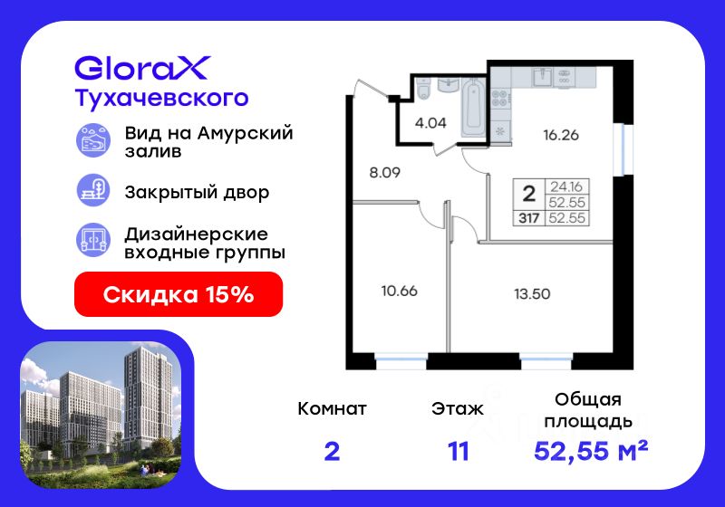 Продается 2-комн. квартира на 11-м этаже в жилом комплексе GloraX Тухачевского — современном проекте нового формата в престижном районе Владивостока. Общая площадь лота составляет 52,55 кв. м, из которых 24,16 кв. м отведено под жилую и 16,26 кв. м под кухонную зону. Номер квартиры - 317. Преимущества квартиры: двухкомнатная квартира, угловая. Преимущества проекта: • Панорамный вид на Амурский залив и зелёные сопки • Удачное расположение и транспортная доступность: Первореченский район, 20 минут до центра города • Закрытая охраняемая территория с доступом только для жителей • Эксклюзивное благоустройство: продуманное зонирование, игровые и спортивные площадки, арт-инсталляция, Тайный сад • Безбарьерная среда, видеонаблюдений, Wi-Fi на территории • Премиальный дизайн входных групп реcепшн и лаунж-зоной • Лапомойки, колясочные и туалеты на первом этаже • Подземный паркинг на 449 машиномест с доступом на лифте с жилых этажей • Индивидуальные кладовые на цокольном этаже от 2 до 10 м2 GloraX Тухачевского — это городское пространство нового формата, которое позволяет современным горожанам находить все необходимые атрибуты комфортной жизни внутри своего жилого комплекса. Весь комплекс спроектирован так, чтобы жить здесь было удобно и безопасно: светлые лаунж-зоны и ресепшн на входах в жилые корпуса, эксклюзивный дизайн мест общего пользования и придомовой территории, круглосуточная охрана, видеонаблюдение и даже детский сад в одном из корпусов все, что необходимо современному городскому жителю. GloraX Тухачевского находится в одном из самых престижных районов города с хорошей, давно сформировавшейся инфраструктурой и отличной транспортной доступностью. Отсюда легко добраться до центра города, других районов и даже пригорода как на собственном транспорте, так и на общественном. Квартал имеет прямой выезд на ул. Тухачевского, а рядом с комплексом расположена автобусная остановка на несколько маршрутов. Проект состоит из 3 монолитных корпусов, объединенных единым стилобатом. В комплексе предусмотрены: подземный паркинг с лифтом на жилые этажи, кладовые для хранения, благоустроенный двор без машин, детские и спортивные площадки, зоны для отдыха и прогулок. Эксклюзивный проект благоустройства территории разработан одной из лучших студий ландшафтного дизайна DEREVOPARK с фокусом на комфорт и удобство для всех жителей комплекса. Вся необходимая инфраструктура — магазины, школы, детские сады, остановки общественного транспорта — находится рядом. Узнайте подробности и подберите свою квартиру в GloraX Тухачевского — в отделе продаж уже сегодня. Цена указана при 100% оплате или стандартной ипотеке. Узнайте подробности в Отделе продаж.
