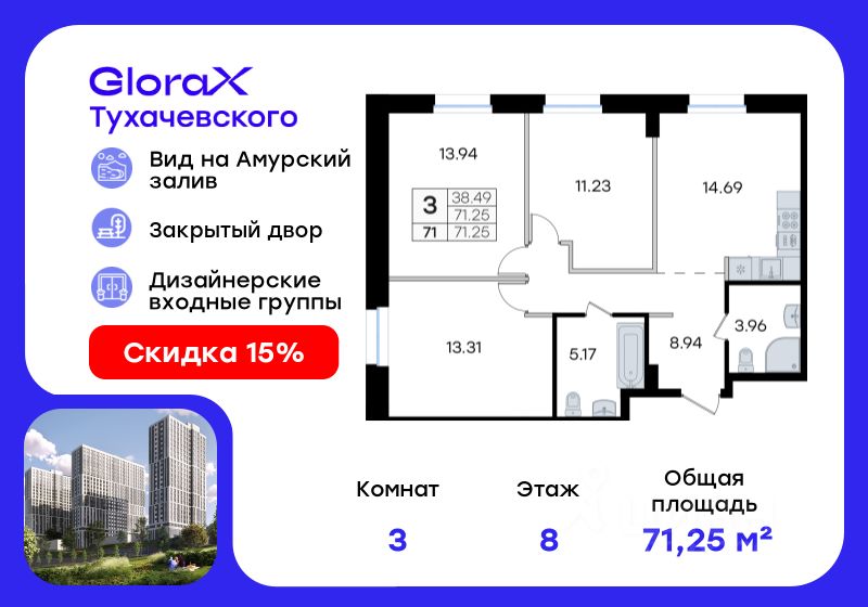Продается 3-комн. квартира на 8-м этаже в жилом комплексе GloraX Тухачевского — современном проекте нового формата в престижном районе Владивостока. Общая площадь лота составляет 71,25 кв. м, из которых 38,49 кв. м отведено под жилую и 14,69 кв. м под кухонную зону. Номер квартиры - 71. Преимущества квартиры: трехкомнатная квартира, угловая, 2 санузла. Преимущества проекта: • Панорамный вид на Амурский залив и зелёные сопки • Удачное расположение и транспортная доступность: Первореченский район, 20 минут до центра города • Закрытая охраняемая территория с доступом только для жителей • Эксклюзивное благоустройство: продуманное зонирование, игровые и спортивные площадки, арт-инсталляция, Тайный сад • Безбарьерная среда, видеонаблюдений, Wi-Fi на территории • Премиальный дизайн входных групп реcепшн и лаунж-зоной • Лапомойки, колясочные и туалеты на первом этаже • Подземный паркинг на 449 машиномест с доступом на лифте с жилых этажей • Индивидуальные кладовые на цокольном этаже от 2 до 10 м2 GloraX Тухачевского — это городское пространство нового формата, которое позволяет современным горожанам находить все необходимые атрибуты комфортной жизни внутри своего жилого комплекса. Весь комплекс спроектирован так, чтобы жить здесь было удобно и безопасно: светлые лаунж-зоны и ресепшн на входах в жилые корпуса, эксклюзивный дизайн мест общего пользования и придомовой территории, круглосуточная охрана, видеонаблюдение и даже детский сад в одном из корпусов все, что необходимо современному городскому жителю. GloraX Тухачевского находится в одном из самых престижных районов города с хорошей, давно сформировавшейся инфраструктурой и отличной транспортной доступностью. Отсюда легко добраться до центра города, других районов и даже пригорода как на собственном транспорте, так и на общественном. Квартал имеет прямой выезд на ул. Тухачевского, а рядом с комплексом расположена автобусная остановка на несколько маршрутов. Проект состоит из 3 монолитных корпусов, объединенных единым стилобатом. В комплексе предусмотрены: подземный паркинг с лифтом на жилые этажи, кладовые для хранения, благоустроенный двор без машин, детские и спортивные площадки, зоны для отдыха и прогулок. Эксклюзивный проект благоустройства территории разработан одной из лучших студий ландшафтного дизайна DEREVOPARK с фокусом на комфорт и удобство для всех жителей комплекса. Вся необходимая инфраструктура — магазины, школы, детские сады, остановки общественного транспорта — находится рядом. Узнайте подробности и подберите свою квартиру в GloraX Тухачевского — в отделе продаж уже сегодня. Цена указана при 100% оплате или стандартной ипотеке. Узнайте подробности в Отделе продаж.