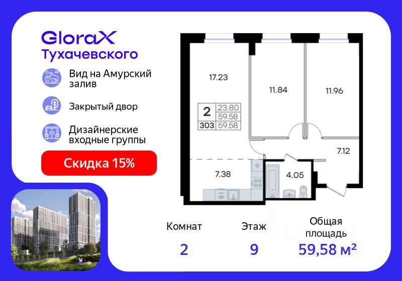 Продается 2-комн. квартира на 12-м этаже в жилом комплексе GloraX Тухачевского — современном проекте нового формата в престижном районе Владивостока. Общая площадь лота составляет 59,58 кв. м, из которых 23,80 кв. м отведено под жилую и 7,38 кв. м под кухонную зону. Номер квартиры - 105. Преимущества квартиры: двухкомнатная квартира. Преимущества проекта: • Панорамный вид на Амурский залив и зелёные сопки • Удачное расположение и транспортная доступность: Первореченский район, 20 минут до центра города • Закрытая охраняемая территория с доступом только для жителей • Эксклюзивное благоустройство: продуманное зонирование, игровые и спортивные площадки, арт-инсталляция, Тайный сад • Безбарьерная среда, видеонаблюдений, Wi-Fi на территории • Премиальный дизайн входных групп реcепшн и лаунж-зоной • Лапомойки, колясочные и туалеты на первом этаже • Подземный паркинг на 449 машиномест с доступом на лифте с жилых этажей • Индивидуальные кладовые на цокольном этаже от 2 до 10 м2 GloraX Тухачевского — это городское пространство нового формата, которое позволяет современным горожанам находить все необходимые атрибуты комфортной жизни внутри своего жилого комплекса. Весь комплекс спроектирован так, чтобы жить здесь было удобно и безопасно: светлые лаунж-зоны и ресепшн на входах в жилые корпуса, эксклюзивный дизайн мест общего пользования и придомовой территории, круглосуточная охрана, видеонаблюдение и даже детский сад в одном из корпусов все, что необходимо современному городскому жителю. GloraX Тухачевского находится в одном из самых престижных районов города с хорошей, давно сформировавшейся инфраструктурой и отличной транспортной доступностью. Отсюда легко добраться до центра города, других районов и даже пригорода как на собственном транспорте, так и на общественном. Квартал имеет прямой выезд на ул. Тухачевского, а рядом с комплексом расположена автобусная остановка на несколько маршрутов. Проект состоит из 3 монолитных корпусов, объединенных единым стилобатом. В комплексе предусмотрены: подземный паркинг с лифтом на жилые этажи, кладовые для хранения, благоустроенный двор без машин, детские и спортивные площадки, зоны для отдыха и прогулок. Эксклюзивный проект благоустройства территории разработан одной из лучших студий ландшафтного дизайна DEREVOPARK с фокусом на комфорт и удобство для всех жителей комплекса. Вся необходимая инфраструктура — магазины, школы, детские сады, остановки общественного транспорта — находится рядом. Узнайте подробности и подберите свою квартиру в GloraX Тухачевского — в отделе продаж уже сегодня. Цена указана при 100% оплате или стандартной ипотеке. Узнайте подробности в Отделе продаж.