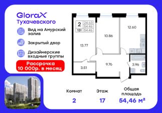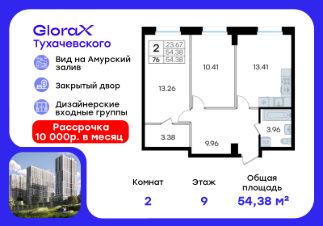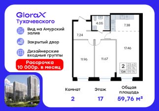 Продается 2-комн. квартира на 21-м этаже в жилом комплексе GloraX Тухачевского — современном проекте нового формата в престижном районе Владивостока. Общая площадь лота составляет 59,64 кв. м, из которых 23,63 кв. м отведено под жилую и 7,38 кв. м под кухонную зону. Номер квартиры - 422.Преимущества квартиры:двухкомнатная квартира, высокий этаж.Преимущества проекта:• Панорамный вид на Амурский залив и зелёные сопки• Удачное расположение и транспортная доступность: Первореченский район, 20 минут до центра города• Закрытая охраняемая территория с доступом только для жителей• Эксклюзивное благоустройство: продуманное зонирование, игровые и спортивные площадки, арт-инсталляция, Тайный сад• Безбарьерная среда, видеонаблюдений, Wi-Fi на территории• Премиальный дизайн входных групп реcепшн и лаунж-зоной• Лапомойки, колясочные и туалеты на первом этаже• Подземный паркинг на 449 машиномест с доступом на лифте с жилых этажей• Индивидуальные кладовые на цокольном этаже от 2 до 10 м2GloraX Тухачевского — это городское пространство нового формата, которое позволяет современным горожанам находить все необходимые атрибуты комфортной жизни внутри своего жилого комплекса. Весь комплекс спроектирован так, чтобы жить здесь было удобно и безопасно: светлые лаунж-зоны и ресепшн на входах в жилые корпуса, эксклюзивный дизайн мест общего пользования и придомовой территории, круглосуточная охрана, видеонаблюдение и даже детский сад в одном из корпусов все, что необходимо современному городскому жителю. GloraX Тухачевского находится в одном из самых престижных районов города с хорошей, давно сформировавшейся инфраструктурой и отличной транспортной доступностью. Отсюда легко добраться до центра города, других районов и даже пригорода как на собственном транспорте, так и на общественном. Квартал имеет прямой выезд на ул. Тухачевского, а рядом с комплексом расположена автобусная остановка на несколько маршрутов.Проект состоит из 3 монолитных корпусов, объединенных единым стилобатом. В комплексе предусмотрены: подземный паркинг с лифтом на жилые этажи, кладовые для хранения, благоустроенный двор без машин, детские и спортивные площадки, зоны для отдыха и прогулок.Эксклюзивный проект благоустройства территории разработан одной из лучших студий ландшафтного дизайна DEREVOPARK с фокусом на комфорт и удобство для всех жителей комплекса.Вся необходимая инфраструктура — магазины, школы, детские сады, остановки общественного транспорта — находится рядом.Узнайте подробности и подберите свою квартиру в GloraX Тухачевского — в отделе продаж уже сегодня.Цена указана при 100% оплате или стандартной ипотеке. Узнайте подробности в Отделе продаж.