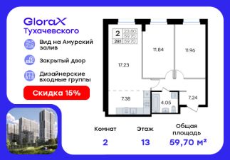 Продается 2-комн. квартира на 10-м этаже в жилом комплексе GloraX Тухачевского — современном проекте нового формата в престижном районе Владивостока. Общая площадь лота составляет 54,36 кв. м, из которых 24,57 кв. м отведено под жилую и 12,60 кв. м под кухонную зону. Номер квартиры - 91.Преимущества квартиры:двухкомнатная квартира, гардеробная.Преимущества проекта:• Панорамный вид на Амурский залив и зелёные сопки• Удачное расположение и транспортная доступность: Первореченский район, 20 минут до центра города• Закрытая охраняемая территория с доступом только для жителей• Эксклюзивное благоустройство: продуманное зонирование, игровые и спортивные площадки, арт-инсталляция, Тайный сад• Безбарьерная среда, видеонаблюдений, Wi-Fi на территории• Премиальный дизайн входных групп реcепшн и лаунж-зоной• Лапомойки, колясочные и туалеты на первом этаже• Подземный паркинг на 449 машиномест с доступом на лифте с жилых этажей• Индивидуальные кладовые на цокольном этаже от 2 до 10 м2GloraX Тухачевского — это городское пространство нового формата, которое позволяет современным горожанам находить все необходимые атрибуты комфортной жизни внутри своего жилого комплекса. Весь комплекс спроектирован так, чтобы жить здесь было удобно и безопасно: светлые лаунж-зоны и ресепшн на входах в жилые корпуса, эксклюзивный дизайн мест общего пользования и придомовой территории, круглосуточная охрана, видеонаблюдение и даже детский сад в одном из корпусов все, что необходимо современному городскому жителю. GloraX Тухачевского находится в одном из самых престижных районов города с хорошей, давно сформировавшейся инфраструктурой и отличной транспортной доступностью. Отсюда легко добраться до центра города, других районов и даже пригорода как на собственном транспорте, так и на общественном. Квартал имеет прямой выезд на ул. Тухачевского, а рядом с комплексом расположена автобусная остановка на несколько маршрутов.Проект состоит из 3 монолитных корпусов, объединенных единым стилобатом. В комплексе предусмотрены: подземный паркинг с лифтом на жилые этажи, кладовые для хранения, благоустроенный двор без машин, детские и спортивные площадки, зоны для отдыха и прогулок.Эксклюзивный проект благоустройства территории разработан одной из лучших студий ландшафтного дизайна DEREVOPARK с фокусом на комфорт и удобство для всех жителей комплекса.Вся необходимая инфраструктура — магазины, школы, детские сады, остановки общественного транспорта — находится рядом.Узнайте подробности и подберите свою квартиру в GloraX Тухачевского — в отделе продаж уже сегодня.Цена указана при 100% оплате или стандартной ипотеке. Узнайте подробности в Отделе продаж.