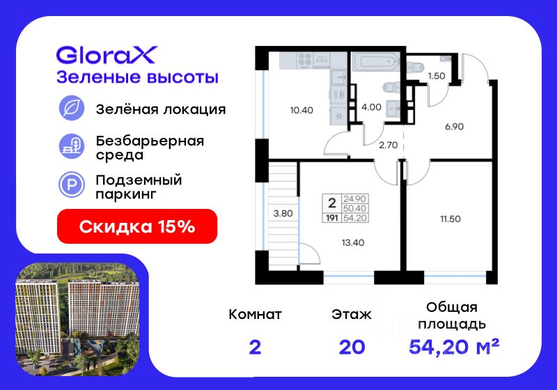 Продается 2-комн. квартира на 20-м этаже в жилом квартале GloraX Зелёные высоты — проекте в тихой зелёной локации. Общая площадь квартиры 54,20 кв. м, из которых 24,90 кв. м включая 24,90 кв. м жилого пространства и 10,40 кв. м кухни. Номер квартиры - 191. Преимущества квартиры: угловая 2 к.кв., лоджия. Преимущества проекта: • Идеальное сочетание городской и загородной жизни • Сдаем в 2025 году • Уютный зелёный район с развитой инфраструктурой • Великолепные виды на Вечнозеленый сквер и лесопарк на 150 Га • Видеонаблюдение, IP-домофон, Wi-Fi на территории, • Дизайнерские входные группы • Безбарьерная среда, колясочные, туалеты на 1 этаже, лапомойки • Эксклюзивное благоустройство территории • Подземный паркинг на 235 машино-мест с лифтом на жилые этажи • Индивидуальные кладовые от 3 до 7 кв. м • Черновая отделка для реализации любых дизайнерских идей GloraX Зелёные высоты — современный жилой проект, сочетающий преимущества городской и пригородной жизни. Комплекс тщательно продуман для максимального удобства и обеспечения безопасности жителей. Квартал расположен в зеленом, живописном и активно развивающемся районе Зеленый Угол, вдали от серой массовой застройки. Жители GloraX Зелёные высоты смогут насладждаться прогулками в Вечнозелёном сквере или лесопарке. В непосредственной близости находятся остановки общественного транспорта и автомобильный подъезд со стороны Нейбута. Скоро также появится выездом на трассу Де-Фриз-Седанка, что обеспечит быстрый доступ в любую часть города и пригород. Проект включает 2 корпуса, каждый из которых спроектирован с акцентом на комфорт, безопасность и современный образ жизни. В комплексе предусмотрен подземный паркинг на 235 машиномест с доступом прямо с жилых этажей. Паркинг оборудован современными системами видеонаблюдения, контроля въезда-выезда и пожаротушения. Цокольный этаж здания отведен под индивидуальные кладовые площадью от 3 до 7 квадратных метров, которые можно использовать для хранения сезонных вещей. Доступ к кладовым - на лифте с жилых этажей. Территория жилого квартала благоустроена и включает игровые зоны и спортивные площадки для детей различных возрастных групп, уютные зоны отдыха со скамейками и универсальную воркаут-площадку для активного досуга. В шаговой доступности располагаются все необходимые объекты социальной инфраструктуры. Узнайте больше в отделе продаж — выберите свою квартиру в GloraX Зелёные высоты уже сегодня!