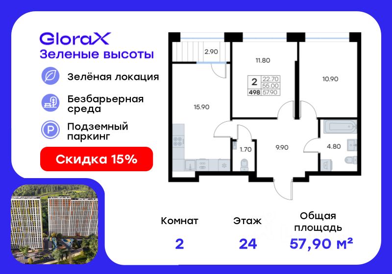 Продается 2-комн. квартира на 24-м этаже в жилом квартале GloraX Зелёные высоты — проекте в тихой зелёной локации. Общая площадь квартиры 57,90 кв. м, из которых 22,70 кв. м включая 22,70 кв. м жилого пространства и 15,90 кв. м кухни. Номер квартиры - 498. Преимущества квартиры: компактная евро-3, лоджия. Преимущества проекта: • Идеальное сочетание городской и загородной жизни • Сдаем в 2025 году • Уютный зелёный район с развитой инфраструктурой • Великолепные виды на Вечнозеленый сквер и лесопарк на 150 Га • Видеонаблюдение, IP-домофон, Wi-Fi на территории, • Дизайнерские входные группы • Безбарьерная среда, колясочные, туалеты на 1 этаже, лапомойки • Эксклюзивное благоустройство территории • Подземный паркинг на 235 машино-мест с лифтом на жилые этажи • Индивидуальные кладовые от 3 до 7 кв. м • Черновая отделка для реализации любых дизайнерских идей GloraX Зелёные высоты — современный жилой проект, сочетающий преимущества городской и пригородной жизни. Комплекс тщательно продуман для максимального удобства и обеспечения безопасности жителей. Квартал расположен в зеленом, живописном и активно развивающемся районе Зеленый Угол, вдали от серой массовой застройки. Жители GloraX Зелёные высоты смогут насладждаться прогулками в Вечнозелёном сквере или лесопарке. В непосредственной близости находятся остановки общественного транспорта и автомобильный подъезд со стороны Нейбута. Скоро также появится выездом на трассу Де-Фриз-Седанка, что обеспечит быстрый доступ в любую часть города и пригород. Проект включает 2 корпуса, каждый из которых спроектирован с акцентом на комфорт, безопасность и современный образ жизни. В комплексе предусмотрен подземный паркинг на 235 машиномест с доступом прямо с жилых этажей. Паркинг оборудован современными системами видеонаблюдения, контроля въезда-выезда и пожаротушения. Цокольный этаж здания отведен под индивидуальные кладовые площадью от 3 до 7 квадратных метров, которые можно использовать для хранения сезонных вещей. Доступ к кладовым - на лифте с жилых этажей. Территория жилого квартала благоустроена и включает игровые зоны и спортивные площадки для детей различных возрастных групп, уютные зоны отдыха со скамейками и универсальную воркаут-площадку для активного досуга. В шаговой доступности располагаются все необходимые объекты социальной инфраструктуры. Узнайте больше в отделе продаж — выберите свою квартиру в GloraX Зелёные высоты уже сегодня!