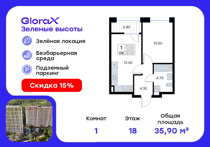 Продается 1-комн. квартира на 18-м этаже в жилом квартале GloraX Зелёные высоты — проекте в тихой зелёной локации. Общая площадь квартиры 35,90 кв. м, из которых 10,50 кв. м включая 10,50 кв. м жилого пространства и 13,60 кв. м кухни. Номер квартиры - 174. Преимущества квартиры: компактная евро-2, лоджия. Преимущества проекта: • Идеальное сочетание городской и загородной жизни • Сдаем в 2025 году • Уютный зелёный район с развитой инфраструктурой • Великолепные виды на Вечнозеленый сквер и лесопарк на 150 Га • Видеонаблюдение, IP-домофон, Wi-Fi на территории, • Дизайнерские входные группы • Безбарьерная среда, колясочные, туалеты на 1 этаже, лапомойки • Эксклюзивное благоустройство территории • Подземный паркинг на 235 машино-мест с лифтом на жилые этажи • Индивидуальные кладовые от 3 до 7 кв. м • Черновая отделка для реализации любых дизайнерских идей GloraX Зелёные высоты — современный жилой проект, сочетающий преимущества городской и пригородной жизни. Комплекс тщательно продуман для максимального удобства и обеспечения безопасности жителей. Квартал расположен в зеленом, живописном и активно развивающемся районе Зеленый Угол, вдали от серой массовой застройки. Жители GloraX Зелёные высоты смогут насладждаться прогулками в Вечнозелёном сквере или лесопарке. В непосредственной близости находятся остановки общественного транспорта и автомобильный подъезд со стороны Нейбута. Скоро также появится выездом на трассу Де-Фриз-Седанка, что обеспечит быстрый доступ в любую часть города и пригород. Проект включает 2 корпуса, каждый из которых спроектирован с акцентом на комфорт, безопасность и современный образ жизни. В комплексе предусмотрен подземный паркинг на 235 машиномест с доступом прямо с жилых этажей. Паркинг оборудован современными системами видеонаблюдения, контроля въезда-выезда и пожаротушения. Цокольный этаж здания отведен под индивидуальные кладовые площадью от 3 до 7 квадратных метров, которые можно использовать для хранения сезонных вещей. Доступ к кладовым - на лифте с жилых этажей. Территория жилого квартала благоустроена и включает игровые зоны и спортивные площадки для детей различных возрастных групп, уютные зоны отдыха со скамейками и универсальную воркаут-площадку для активного досуга. В шаговой доступности располагаются все необходимые объекты социальной инфраструктуры. Узнайте больше в отделе продаж — выберите свою квартиру в GloraX Зелёные высоты уже сегодня!