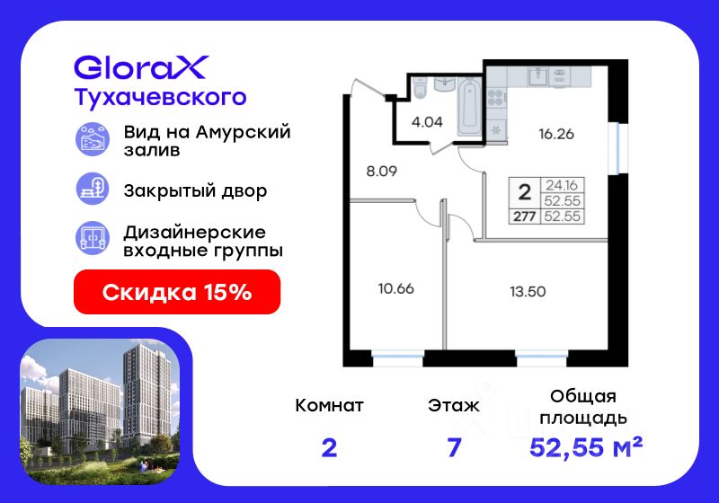 Продается 2-комн. квартира на 7-м этаже в жилом комплексе GloraX Тухачевского — современном проекте нового формата в престижном районе Владивостока. Общая площадь лота составляет 52,55 кв. м, из которых 24,16 кв. м отведено под жилую и 16,26 кв. м под кухонную зону. Номер квартиры - 277. Преимущества квартиры: двухкомнатная квартира, угловая. Преимущества проекта: • Панорамный вид на Амурский залив и зелёные сопки • Удачное расположение и транспортная доступность: Первореченский район, 20 минут до центра города • Закрытая охраняемая территория с доступом только для жителей • Эксклюзивное благоустройство: продуманное зонирование, игровые и спортивные площадки, арт-инсталляция, Тайный сад • Безбарьерная среда, видеонаблюдений, Wi-Fi на территории • Премиальный дизайн входных групп реcепшн и лаунж-зоной • Лапомойки, колясочные и туалеты на первом этаже • Подземный паркинг на 449 машиномест с доступом на лифте с жилых этажей • Индивидуальные кладовые на цокольном этаже от 2 до 10 м2 GloraX Тухачевского — это городское пространство нового формата, которое позволяет современным горожанам находить все необходимые атрибуты комфортной жизни внутри своего жилого комплекса. Весь комплекс спроектирован так, чтобы жить здесь было удобно и безопасно: светлые лаунж-зоны и ресепшн на входах в жилые корпуса, эксклюзивный дизайн мест общего пользования и придомовой территории, круглосуточная охрана, видеонаблюдение и даже детский сад в одном из корпусов все, что необходимо современному городскому жителю. GloraX Тухачевского находится в одном из самых престижных районов города с хорошей, давно сформировавшейся инфраструктурой и отличной транспортной доступностью. Отсюда легко добраться до центра города, других районов и даже пригорода как на собственном транспорте, так и на общественном. Квартал имеет прямой выезд на ул. Тухачевского, а рядом с комплексом расположена автобусная остановка на несколько маршрутов. Проект состоит из 3 монолитных корпусов, объединенных единым стилобатом. В комплексе предусмотрены: подземный паркинг с лифтом на жилые этажи, кладовые для хранения, благоустроенный двор без машин, детские и спортивные площадки, зоны для отдыха и прогулок. Эксклюзивный проект благоустройства территории разработан одной из лучших студий ландшафтного дизайна DEREVOPARK с фокусом на комфорт и удобство для всех жителей комплекса. Вся необходимая инфраструктура — магазины, школы, детские сады, остановки общественного транспорта — находится рядом. Узнайте подробности и подберите свою квартиру в GloraX Тухачевского — в отделе продаж уже сегодня. Цена указана при 100% оплате или стандартной ипотеке. Узнайте подробности в Отделе продаж.
