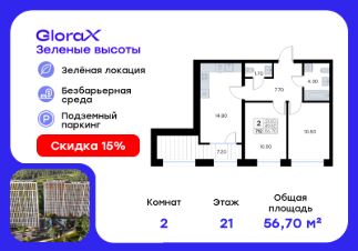 Продается 2-комн. квартира на 21-м этаже в жилом квартале GloraX Зелёные высоты — проекте в тихой зелёной локации. Общая площадь квартиры 56,70 кв. м, из которых 21,00 кв. м включая 21,00 кв. м жилого пространства и 14,80 кв. м кухни. Номер квартиры - 712.Преимущества квартиры:компактная евро-3, лоджия.Преимущества проекта:• Идеальное сочетание городской и загородной жизни• Сдаем в 2025 году• Уютный зелёный район с развитой инфраструктурой• Великолепные виды на Вечнозеленый сквер и лесопарк на 150 Га• Видеонаблюдение, IP-домофон, Wi-Fi на территории,• Дизайнерские входные группы• Безбарьерная среда, колясочные, туалеты на 1 этаже, лапомойки• Эксклюзивное благоустройство территории • Подземный паркинг на 235 машино-мест с лифтом на жилые этажи• Индивидуальные кладовые от 3 до 7 кв. м• Черновая отделка для реализации любых дизайнерских идейGloraX Зелёные высоты — современный жилой проект, сочетающий преимущества городской и пригородной жизни. Комплекс тщательно продуман для максимального удобства и обеспечения безопасности жителей. Квартал расположен в зеленом, живописном и активно развивающемся районе Зеленый Угол, вдали от серой массовой застройки. Жители GloraX Зелёные высоты смогут насладждаться прогулками в Вечнозелёном сквере или лесопарке. В непосредственной близости находятся остановки общественного транспорта и автомобильный подъезд со стороны Нейбута. Скоро также появится выездом на трассу Де-Фриз-Седанка, что обеспечит быстрый доступ в любую часть города и пригород.Проект включает 2 корпуса, каждый из которых спроектирован с акцентом на комфорт, безопасность и современный образ жизни.В комплексе предусмотрен подземный паркинг на 235 машиномест с доступом прямо с жилых этажей. Паркинг оборудован современными системами видеонаблюдения, контроля въезда-выезда и пожаротушения. Цокольный этаж здания отведен под индивидуальные кладовые площадью от 3 до 7 квадратных метров, которые можно использовать для хранения сезонных вещей. Доступ к кладовым - на лифте с жилых этажей.Территория жилого квартала благоустроена и включает игровые зоны и спортивные площадки для детей различных возрастных групп, уютные зоны отдыха со скамейками и универсальную воркаут-площадку для активного досуга.В шаговой доступности располагаются все необходимые объекты социальной инфраструктуры.Узнайте больше в отделе продаж — выберите свою квартиру в GloraX Зелёные высоты уже сегодня!