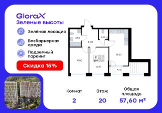 Продается 2-комн. квартира на 23-м этаже в жилом квартале GloraX Зелёные высоты — проекте в тихой зелёной локации. Общая площадь квартиры 57,60 кв. м, из которых 20,70 кв. м включая 20,70 кв. м жилого пространства и 15,00 кв. м кухни. Номер квартиры - 482.Преимущества квартиры:компактная евро-3, лоджия.Преимущества проекта:• Идеальное сочетание городской и загородной жизни• Сдаем в 2025 году• Уютный зелёный район с развитой инфраструктурой• Великолепные виды на Вечнозеленый сквер и лесопарк на 150 Га• Видеонаблюдение, IP-домофон, Wi-Fi на территории,• Дизайнерские входные группы• Безбарьерная среда, колясочные, туалеты на 1 этаже, лапомойки• Эксклюзивное благоустройство территории • Подземный паркинг на 235 машино-мест с лифтом на жилые этажи• Индивидуальные кладовые от 3 до 7 кв. м• Черновая отделка для реализации любых дизайнерских идейGloraX Зелёные высоты — современный жилой проект, сочетающий преимущества городской и пригородной жизни. Комплекс тщательно продуман для максимального удобства и обеспечения безопасности жителей. Квартал расположен в зеленом, живописном и активно развивающемся районе Зеленый Угол, вдали от серой массовой застройки. Жители GloraX Зелёные высоты смогут насладждаться прогулками в Вечнозелёном сквере или лесопарке. В непосредственной близости находятся остановки общественного транспорта и автомобильный подъезд со стороны Нейбута. Скоро также появится выездом на трассу Де-Фриз-Седанка, что обеспечит быстрый доступ в любую часть города и пригород.Проект включает 2 корпуса, каждый из которых спроектирован с акцентом на комфорт, безопасность и современный образ жизни.В комплексе предусмотрен подземный паркинг на 235 машиномест с доступом прямо с жилых этажей. Паркинг оборудован современными системами видеонаблюдения, контроля въезда-выезда и пожаротушения. Цокольный этаж здания отведен под индивидуальные кладовые площадью от 3 до 7 квадратных метров, которые можно использовать для хранения сезонных вещей. Доступ к кладовым - на лифте с жилых этажей.Территория жилого квартала благоустроена и включает игровые зоны и спортивные площадки для детей различных возрастных групп, уютные зоны отдыха со скамейками и универсальную воркаут-площадку для активного досуга.В шаговой доступности располагаются все необходимые объекты социальной инфраструктуры.Узнайте больше в отделе продаж — выберите свою квартиру в GloraX Зелёные высоты уже сегодня!