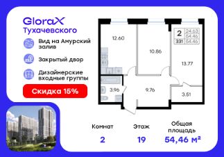 Продается 2-комн. квартира на 19-м этаже в жилом комплексе GloraX Тухачевского — современном проекте нового формата в престижном районе Владивостока. Общая площадь лота составляет 54,46 кв. м, из которых 24,63 кв. м отведено под жилую и 12,60 кв. м под кухонную зону. Номер квартиры - 331.Преимущества квартиры:двухкомнатная квартира, вид на море, высокий этаж, гардеробная.Преимущества проекта:• Панорамный вид на Амурский залив и зелёные сопки• Удачное расположение и транспортная доступность: Первореченский район, 20 минут до центра города• Закрытая охраняемая территория с доступом только для жителей• Эксклюзивное благоустройство: продуманное зонирование, игровые и спортивные площадки, арт-инсталляция, Тайный сад• Безбарьерная среда, видеонаблюдений, Wi-Fi на территории• Премиальный дизайн входных групп реcепшн и лаунж-зоной• Лапомойки, колясочные и туалеты на первом этаже• Подземный паркинг на 449 машиномест с доступом на лифте с жилых этажей• Индивидуальные кладовые на цокольном этаже от 2 до 10 м2GloraX Тухачевского — это городское пространство нового формата, которое позволяет современным горожанам находить все необходимые атрибуты комфортной жизни внутри своего жилого комплекса. Весь комплекс спроектирован так, чтобы жить здесь было удобно и безопасно: светлые лаунж-зоны и ресепшн на входах в жилые корпуса, эксклюзивный дизайн мест общего пользования и придомовой территории, круглосуточная охрана, видеонаблюдение и даже детский сад в одном из корпусов все, что необходимо современному городскому жителю. GloraX Тухачевского находится в одном из самых престижных районов города с хорошей, давно сформировавшейся инфраструктурой и отличной транспортной доступностью. Отсюда легко добраться до центра города, других районов и даже пригорода как на собственном транспорте, так и на общественном. Квартал имеет прямой выезд на ул. Тухачевского, а рядом с комплексом расположена автобусная остановка на несколько маршрутов.Проект состоит из 3 монолитных корпусов, объединенных единым стилобатом. В комплексе предусмотрены: подземный паркинг с лифтом на жилые этажи, кладовые для хранения, благоустроенный двор без машин, детские и спортивные площадки, зоны для отдыха и прогулок.Эксклюзивный проект благоустройства территории разработан одной из лучших студий ландшафтного дизайна DEREVOPARK с фокусом на комфорт и удобство для всех жителей комплекса.Вся необходимая инфраструктура — магазины, школы, детские сады, остановки общественного транспорта — находится рядом.Узнайте подробности и подберите свою квартиру в GloraX Тухачевского — в отделе продаж уже сегодня.Цена указана при 100% оплате или стандартной ипотеке. Узнайте подробности в Отделе продаж.
