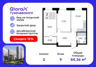 Продается 2-комн. квартира на 9-м этаже в жилом комплексе GloraX Тухачевского — современном проекте нового формата в престижном районе Владивостока. Общая площадь лота составляет 54,36 кв. м, из которых 24,52 кв. м отведено под жилую и 12,60 кв. м под кухонную зону. Номер квартиры - 67.Преимущества квартиры:двухкомнатная квартира, гардеробная.Преимущества проекта:• Панорамный вид на Амурский залив и зелёные сопки• Удачное расположение и транспортная доступность: Первореченский район, 20 минут до центра города• Закрытая охраняемая территория с доступом только для жителей• Эксклюзивное благоустройство: продуманное зонирование, игровые и спортивные площадки, арт-инсталляция, Тайный сад• Безбарьерная среда, видеонаблюдений, Wi-Fi на территории• Премиальный дизайн входных групп реcепшн и лаунж-зоной• Лапомойки, колясочные и туалеты на первом этаже• Подземный паркинг на 449 машиномест с доступом на лифте с жилых этажей• Индивидуальные кладовые на цокольном этаже от 2 до 10 м2GloraX Тухачевского — это городское пространство нового формата, которое позволяет современным горожанам находить все необходимые атрибуты комфортной жизни внутри своего жилого комплекса. Весь комплекс спроектирован так, чтобы жить здесь было удобно и безопасно: светлые лаунж-зоны и ресепшн на входах в жилые корпуса, эксклюзивный дизайн мест общего пользования и придомовой территории, круглосуточная охрана, видеонаблюдение и даже детский сад в одном из корпусов все, что необходимо современному городскому жителю. GloraX Тухачевского находится в одном из самых престижных районов города с хорошей, давно сформировавшейся инфраструктурой и отличной транспортной доступностью. Отсюда легко добраться до центра города, других районов и даже пригорода как на собственном транспорте, так и на общественном. Квартал имеет прямой выезд на ул. Тухачевского, а рядом с комплексом расположена автобусная остановка на несколько маршрутов.Проект состоит из 3 монолитных корпусов, объединенных единым стилобатом. В комплексе предусмотрены: подземный паркинг с лифтом на жилые этажи, кладовые для хранения, благоустроенный двор без машин, детские и спортивные площадки, зоны для отдыха и прогулок.Эксклюзивный проект благоустройства территории разработан одной из лучших студий ландшафтного дизайна DEREVOPARK с фокусом на комфорт и удобство для всех жителей комплекса.Вся необходимая инфраструктура — магазины, школы, детские сады, остановки общественного транспорта — находится рядом.Узнайте подробности и подберите свою квартиру в GloraX Тухачевского — в отделе продаж уже сегодня.Цена указана при 100% оплате или стандартной ипотеке. Узнайте подробности в Отделе продаж.