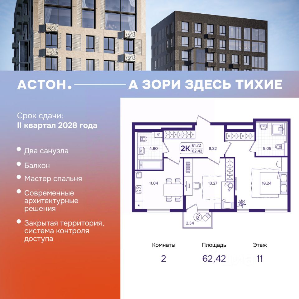 Спешите забронировать по этой цене, предложение ограничено! Стоимость квартиры указана со скидкой, ваша экономия составит 349,000 руб. По всем вопросам звоните в офис продаж, мы вам все подробно расскажем. Продается 2-комн. квартира в ЖК ''Астон. А зори здесь тихие'' на 11 этаже. Квартира без отделки, полностью готова к ремонту. Общая площадь: 62.42 кв.м., жилая: 31.51 кв.м., площадь просторной кухни-столовой: 11.04 кв.м. Комнаты изолированные, все окна выходят на одну сторону. В квартире один балкон, два совмещенных санузла. Высота потолков 2.87 м. Мы позаботились о том, чтобы сберечь ваше время и силы на все основные грязные, шумные ремонтные работы. В квартире предусмотрена черновая отделка: возведены стены, выполнена стяжка пола и нанесена улучшенная гипсовая штукатурка. Поверхности дополнительно прошпаклёваны базовым слоем. Семейная 2-комнатная квартира с балконом и мастер-спальней отлично подойдет для проживания пары с детьми. Здесь предусмотрена кухня, приватная родительская зона, детская комната и 2 санузла. Пространства для сна, учебы, семейного отдыха хватит всем членам семьи. Утренние сборы проходят без очередей. Благодаря просторной прихожей и большому количеству мест хранения в квартире легко поддерживать порядок, а дождь и снег останутся у входа. Дом монолитный, трехподъездный, высотой 17 этажей. Квартира находится в 1-й секции в корпусе 1. На этаже 4 квартиры. В подъезде 1 пассажирский и 1 грузовой лифт. Окончание строительства - 2 квартал 2028 года. Оформление сделки по договору долевого участия. ''Астон. А зори здесь тихие'' — жилой дом бизнес-класса, состоящий из трёх 17-этажных секций, объединенных общим стилобатом. В каждой секции по 2 лифта, количество квартир на этаже — до 5. Для жителей предусмотрены подземный трехуровневый паркинг, кладовые помещения и колясочные, коммерческая инфраструктура на первом этаже. Территория жилого комплекса продумана так, чтобы ее жителям было безопасно и комфортно: — закрытый двор без машин, система контроля доступа, — детские площадки с учетом разных возрастных групп, — воркаут-зона, — безбарьерная среда, — велопарковки, Расположение: Жилой комплекс расположен на Патрокле — одном из самых быстроразвивающихся районов города. В пешей доступности — школа и детские сады, четыре пляжа, парк у озера и набережная для прогулок, торговый центр. В 10 минутах езды на автомобиле — Русский остров и бухта Золотой Рог, в 1 минуте — объездная Седанка—Патрокл. Добраться в любую точку города быстро и легко! Способы покупки: — дальневосточная ипотека, — семейная ипотека, — IT-ипотека, — ипотека для участников СВО и их семей, — рассрочка, О застройщике: Строительство проекта ''Астон. А зори здесь тихие'' осуществляет федеральный застройщик Астон. Проекты Астон — это современные жилые кварталы с вниманием к деталям и продуманным благоустройством в 4 городах России: Екатеринбурге, Новосибирске, Тюмени и Владивостоке. #zMD0EI