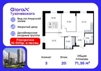 Продается 3-комн. квартира на 12-м этаже в жилом комплексе GloraX Тухачевского — современном проекте нового формата в престижном районе Владивостока. Общая площадь лота составляет 71,25 кв. м, из которых 38,49 кв. м отведено под жилую и 14,69 кв. м под кухонную зону. Номер квартиры - 326.Преимущества квартиры:трехкомнатная квартира, вид на море, угловая, 2 санузла.Преимущества проекта:• Панорамный вид на Амурский залив и зелёные сопки• Удачное расположение и транспортная доступность: Первореченский район, 20 минут до центра города• Закрытая охраняемая территория с доступом только для жителей• Эксклюзивное благоустройство: продуманное зонирование, игровые и спортивные площадки, арт-инсталляция, Тайный сад• Безбарьерная среда, видеонаблюдений, Wi-Fi на территории• Премиальный дизайн входных групп реcепшн и лаунж-зоной• Лапомойки, колясочные и туалеты на первом этаже• Подземный паркинг на 449 машиномест с доступом на лифте с жилых этажей• Индивидуальные кладовые на цокольном этаже от 2 до 10 м2GloraX Тухачевского — это городское пространство нового формата, которое позволяет современным горожанам находить все необходимые атрибуты комфортной жизни внутри своего жилого комплекса. Весь комплекс спроектирован так, чтобы жить здесь было удобно и безопасно: светлые лаунж-зоны и ресепшн на входах в жилые корпуса, эксклюзивный дизайн мест общего пользования и придомовой территории, круглосуточная охрана, видеонаблюдение и даже детский сад в одном из корпусов все, что необходимо современному городскому жителю. GloraX Тухачевского находится в одном из самых престижных районов города с хорошей, давно сформировавшейся инфраструктурой и отличной транспортной доступностью. Отсюда легко добраться до центра города, других районов и даже пригорода как на собственном транспорте, так и на общественном. Квартал имеет прямой выезд на ул. Тухачевского, а рядом с комплексом расположена автобусная остановка на несколько маршрутов.Проект состоит из 3 монолитных корпусов, объединенных единым стилобатом. В комплексе предусмотрены: подземный паркинг с лифтом на жилые этажи, кладовые для хранения, благоустроенный двор без машин, детские и спортивные площадки, зоны для отдыха и прогулок.Эксклюзивный проект благоустройства территории разработан одной из лучших студий ландшафтного дизайна DEREVOPARK с фокусом на комфорт и удобство для всех жителей комплекса.Вся необходимая инфраструктура — магазины, школы, детские сады, остановки общественного транспорта — находится рядом.Узнайте подробности и подберите свою квартиру в GloraX Тухачевского — в отделе продаж уже сегодня.Цена указана при 100% оплате или стандартной ипотеке. Узнайте подробности в Отделе продаж.