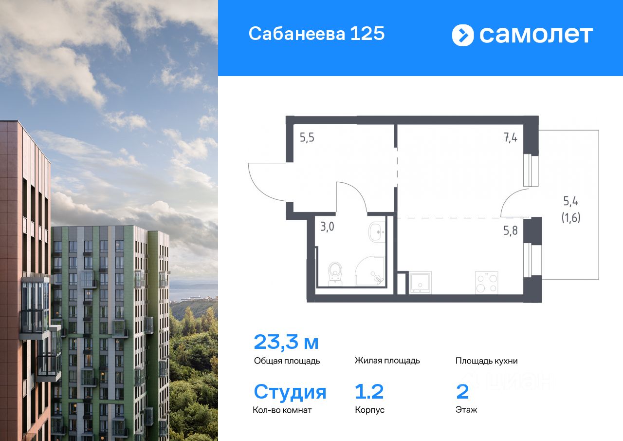 Предлагается квартира студия комфорт-класса 23,3 кв.м в корпусе 1.2 на 2 этаже, в ЖК ''Сабанеева 125'' Квартира без отделки. Доступность опции ''отделка'' и возможность комплектации мебелью и декором уточняйте у застройщика. Приобрести квартиру возможно по специальным акциям от застройщика, с текущими условиями акций можно ознакомиться в блоке ''Акций''. Цена динамическая и может отличаться, уточняйте актуальность у застройщика. В жилом комплексе ''Сабанеева 125'' вы ежедневно будете наслаждаться видами сопок. Холмистый рельеф защищает территорию от ветра. Комплекс расположен в Первореченском районе Владивостока, всего в 20 минутах на машине до центра города. На первых этажах откроются супермаркеты, кафе и пекарни. Для малышей — детский сад в 2 минутах пешком и школа в 10 минутах. За 6 минут можно доехать до Нагорного парка, а за 15 минут — до набережной Цесаревича с панорамой Золотого моста. Комплекс состоит из 3 монолитных домов высотой 25 этажей с фасадами, дизайн которых вдохновлен птицами Дальнего Востока. Дворы оформлены как сад с дальневосточной флорой, есть смотровые площадки, скалодром, перголы и игровые зоны для детей. Подземный паркинг — трехуровневый. В сквозные подъезды без ступеней и с помещением для колясок удобно заходить. В жилом комплексе ''Сабанеева 125'' есть квартиры с индивидуальными зелеными террасами, увеличенными окнами и панорамными балконами для чаепитий с видом на сопки и залив.