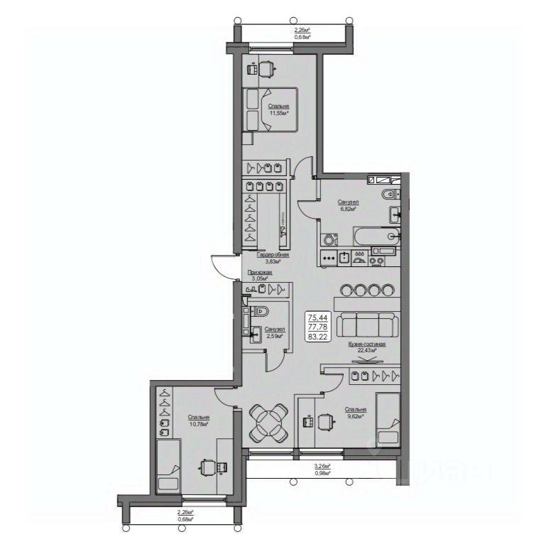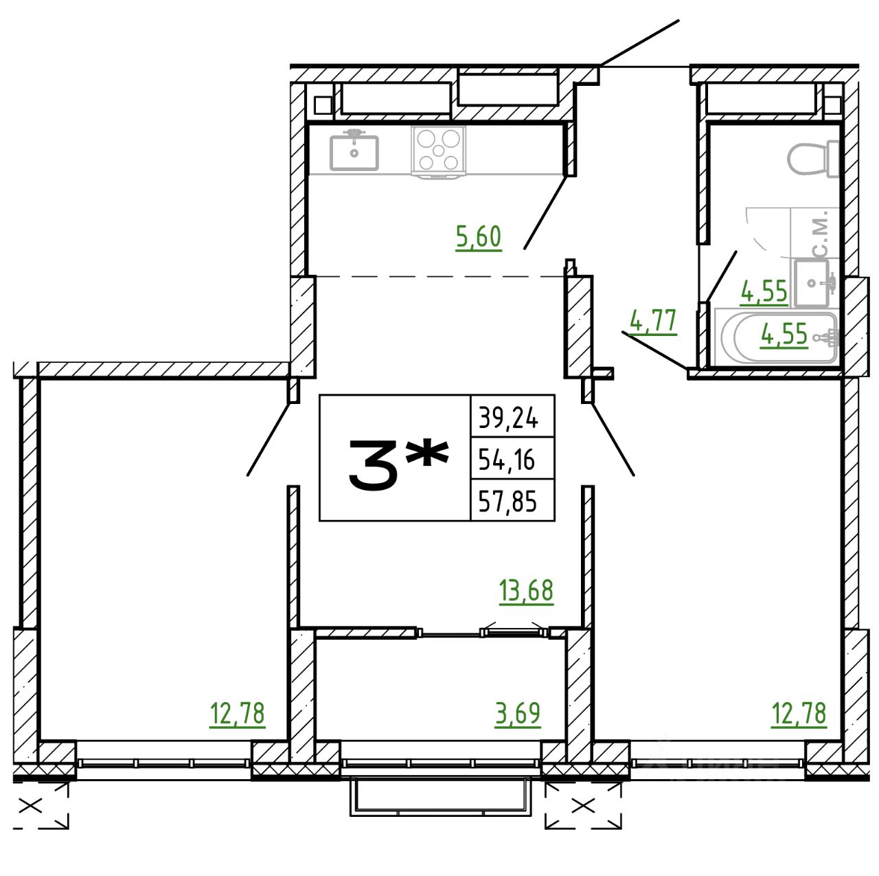 Продаётся 3-комнатная квартира в строящемся доме (Дом 1), срок сдачи: II-кв. 2027, общей площадью 55.28 кв.м., на 3 этаже.